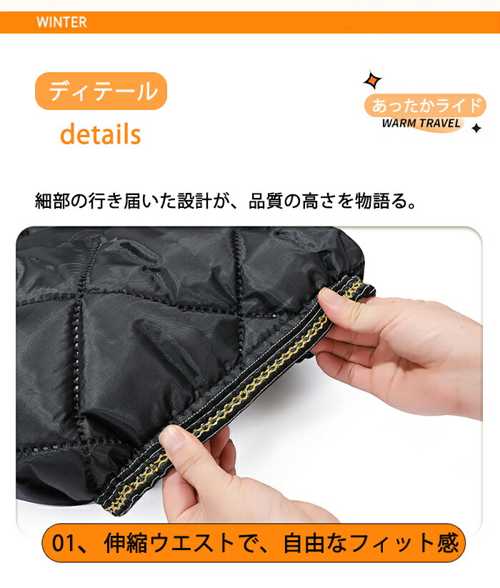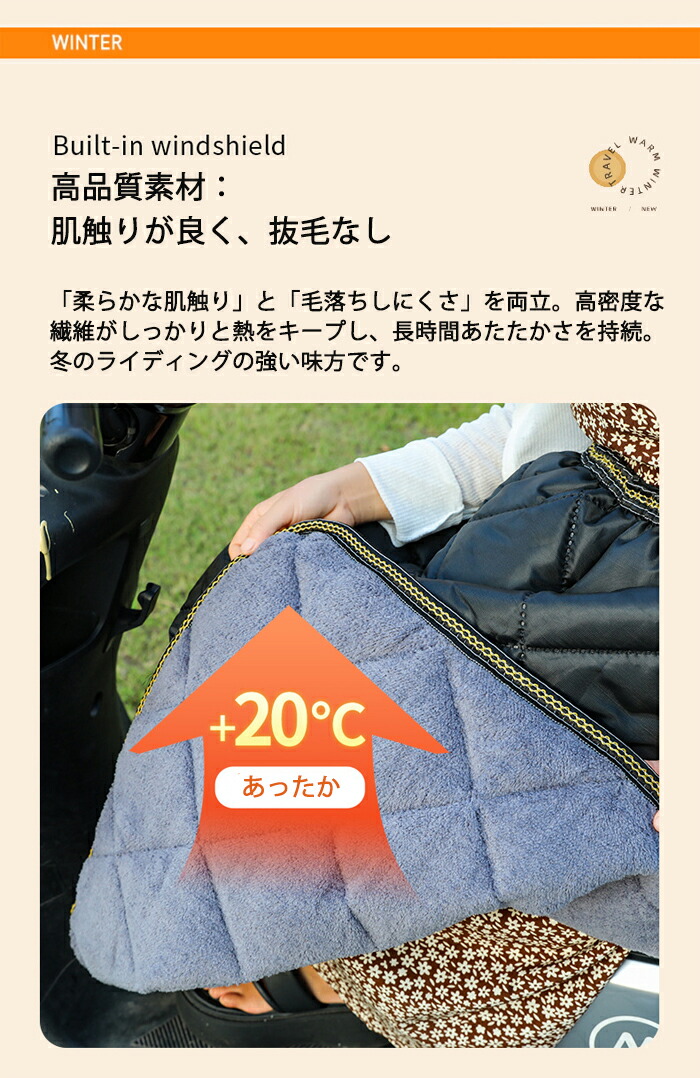 大型ワイド設計が、太ももから腰までをしっかりガード。隙間からの冷たい風を遮断し、全身を包み込むようなあたたかさを実現します。