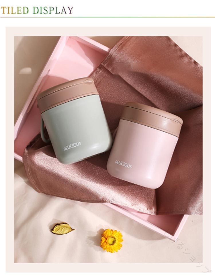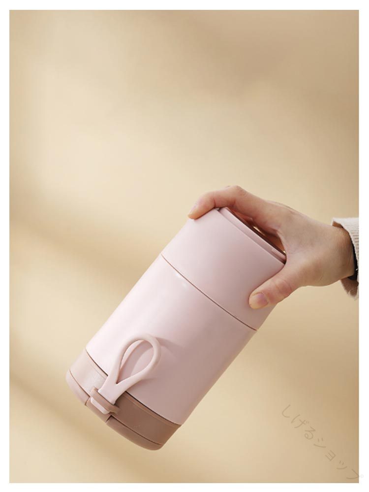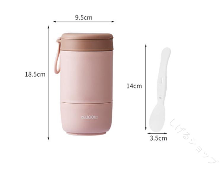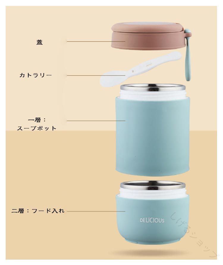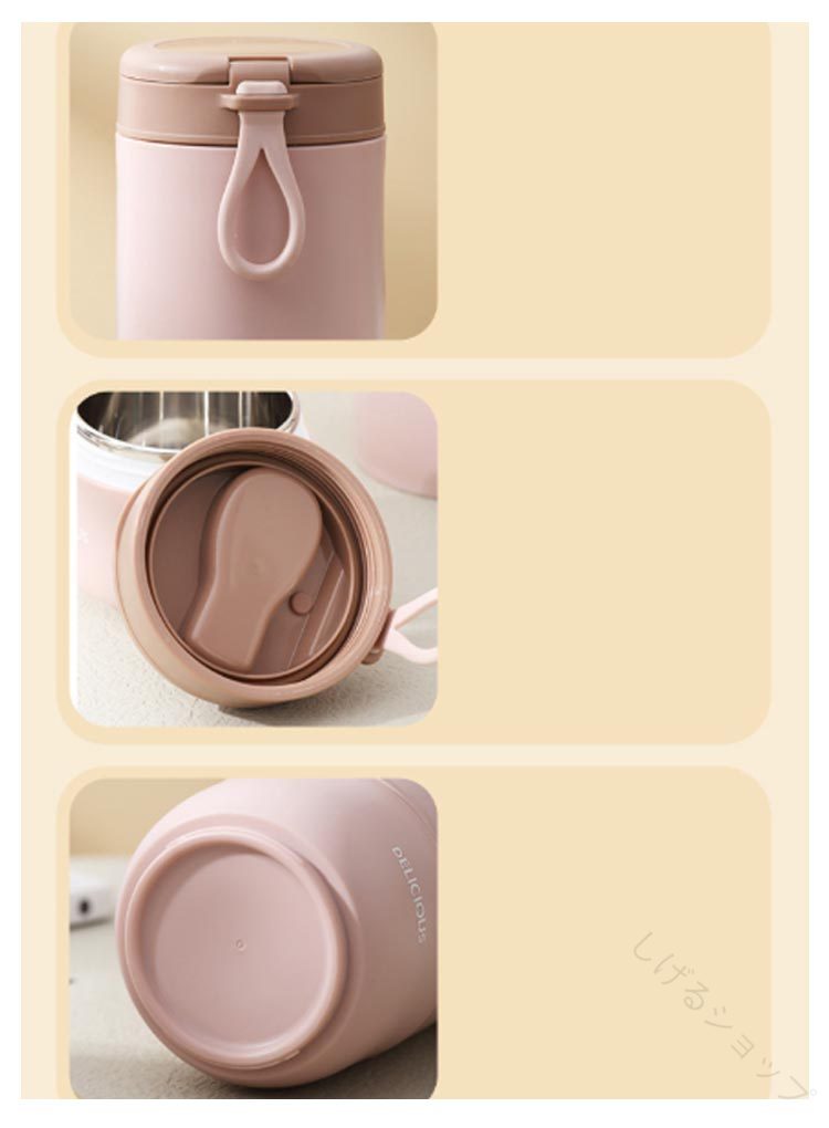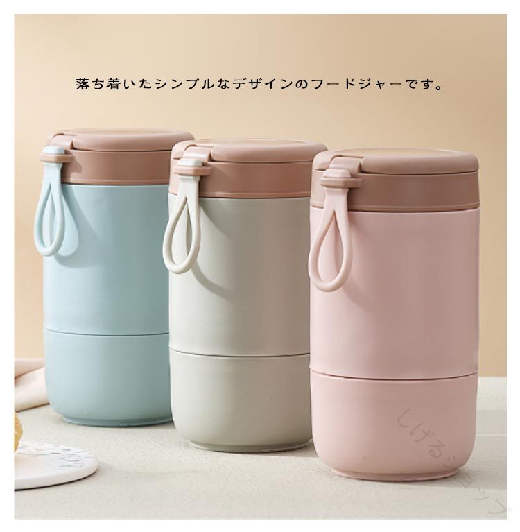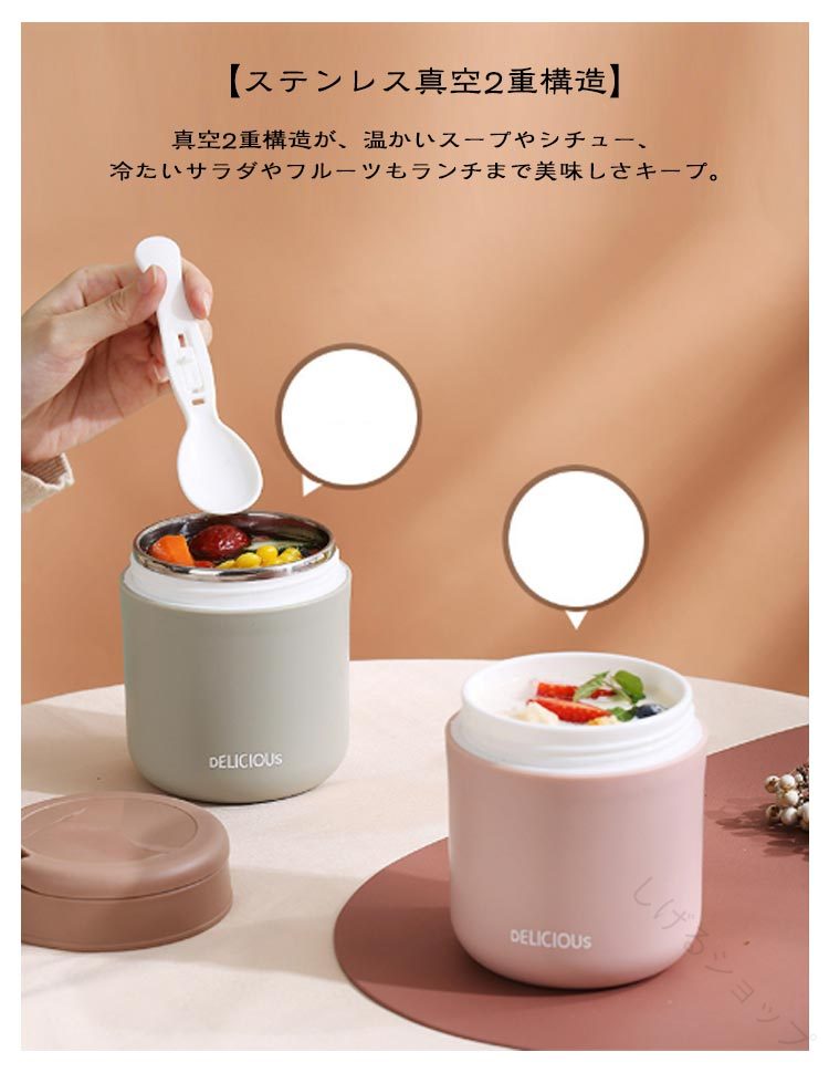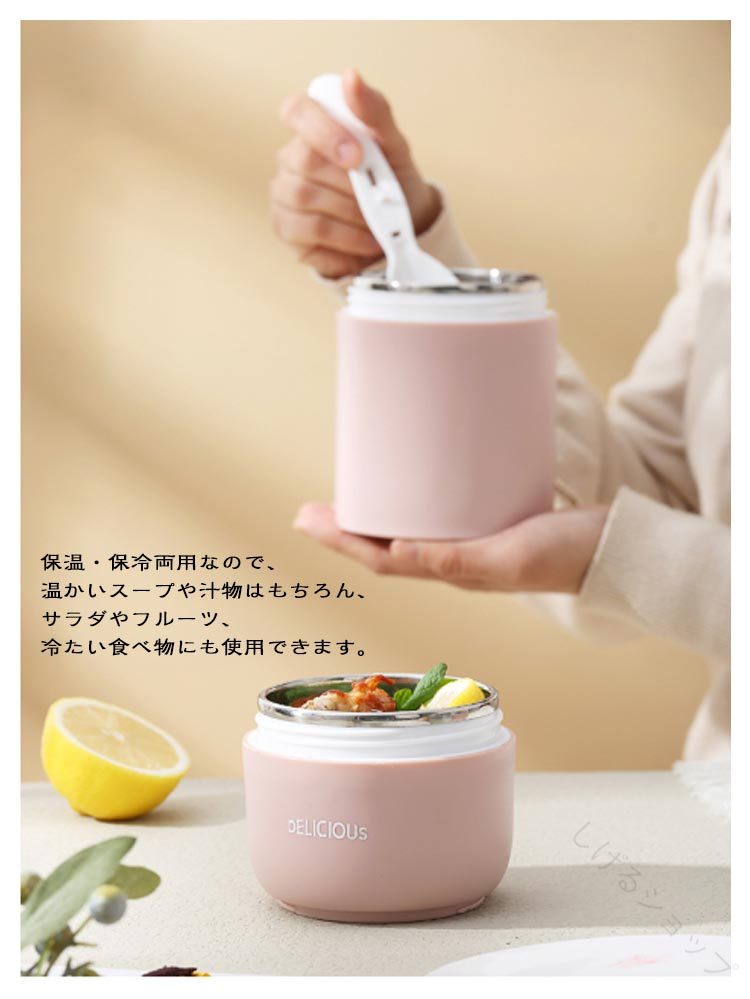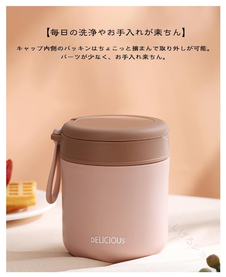 折りたたみ式スプーン内蔵430ml(一層設計)/800ml(二層設計)内層304ステンレス(電子レンジ対応不可)/内層PP(電子レンジ対応可能)落ち着いたシンプルなデザインのフードジャーです。手作りのお弁当はフードジャーにおまかせ!おいしい温度でどこでもランチ。保温・保冷両用なので、温かいスープや汁物はもちろん、サラダやフルーツ、冷たい食べ物にも使用できます。口が広くて、注ぎやすく、食べやすい。樹脂製の飲み口でやさしい口あたり。パッキンやパーツは、しっかり洗えて衛生的です。<お勧めポイント>【ステンレス真空2重構造】真空2重構造が、温かいスープやシチュー、 冷たいサラダやフルーツもランチまで美味しさキープ。【注ぎやすいワイドな飲み口】ポット開口部は、スープや具材が注ぎやすく掬いやすいワイド設計。毎朝のお弁当の準備もスムーズ。【液漏れもしっかり防止!】しっかり閉まるネジ式のキャップと内側のパッキンがスープの漏れを防止! 安心して持ち運べる♪【毎日の洗浄やお手入れが楽ちん】キャップ内側のパッキンはちょこっと摘まんで取り外しが可能。パーツが少なく、お手入れ楽ちん。【コロンと手に馴染むフォルム】コロンと丸みを持たせた優しいフォルムで、 手のひらにちょこんと載せればくつろぎランチタイム。