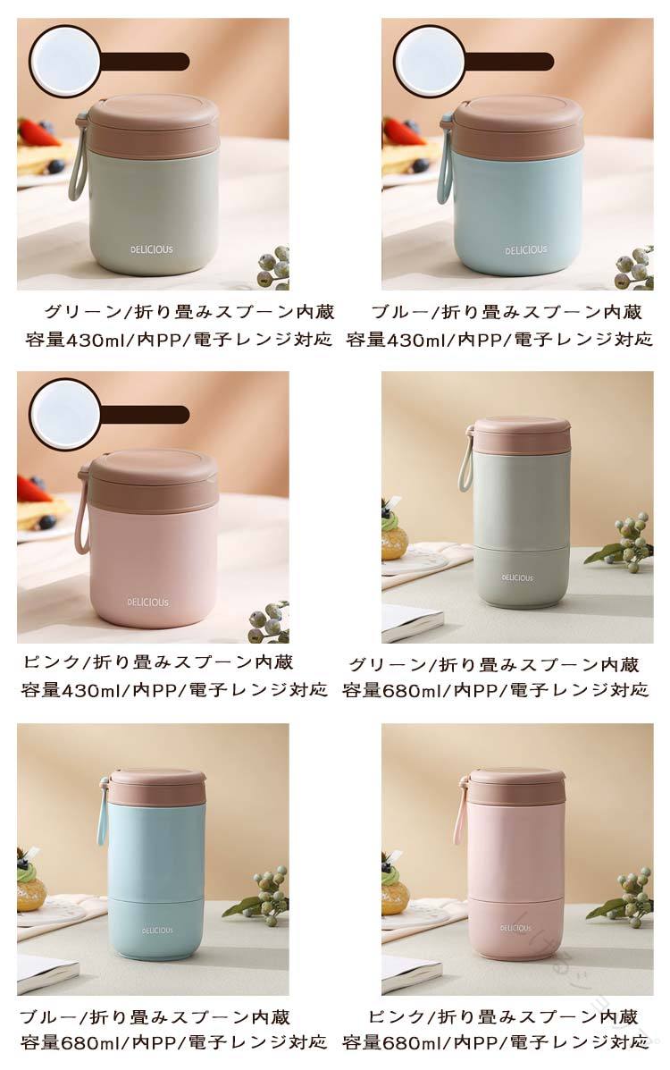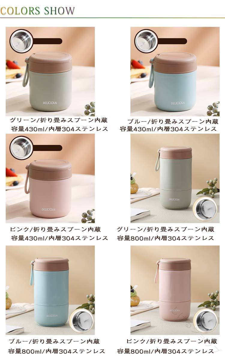 保温弁当箱 800ml スープジャー 弁当箱 水筒 保温ランチジャー 人気 グリーン/折り畳みスプーン内蔵 ブルー/折り畳みスプーン内蔵 ピンク/折り畳みスプーン内蔵 容量430ml/内層304ステンレス 容量800ml/内層304ステンレス 容量430ml/内PP/電子レンジ対応 容量680ml/内PP/電子レンジ対応