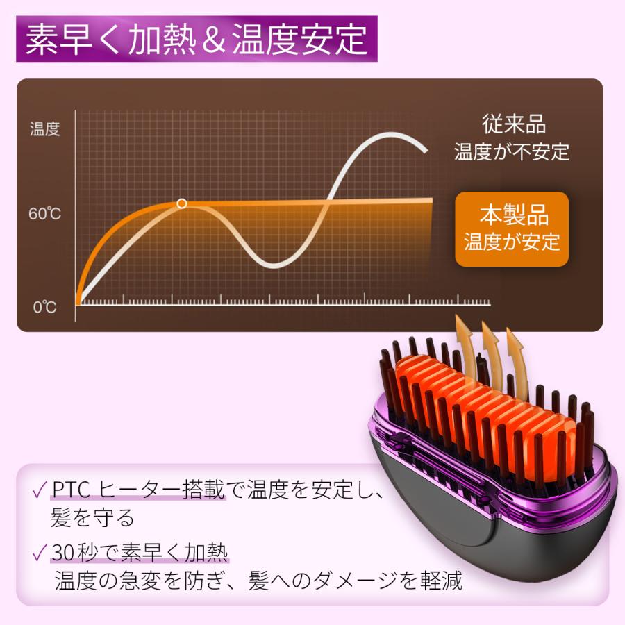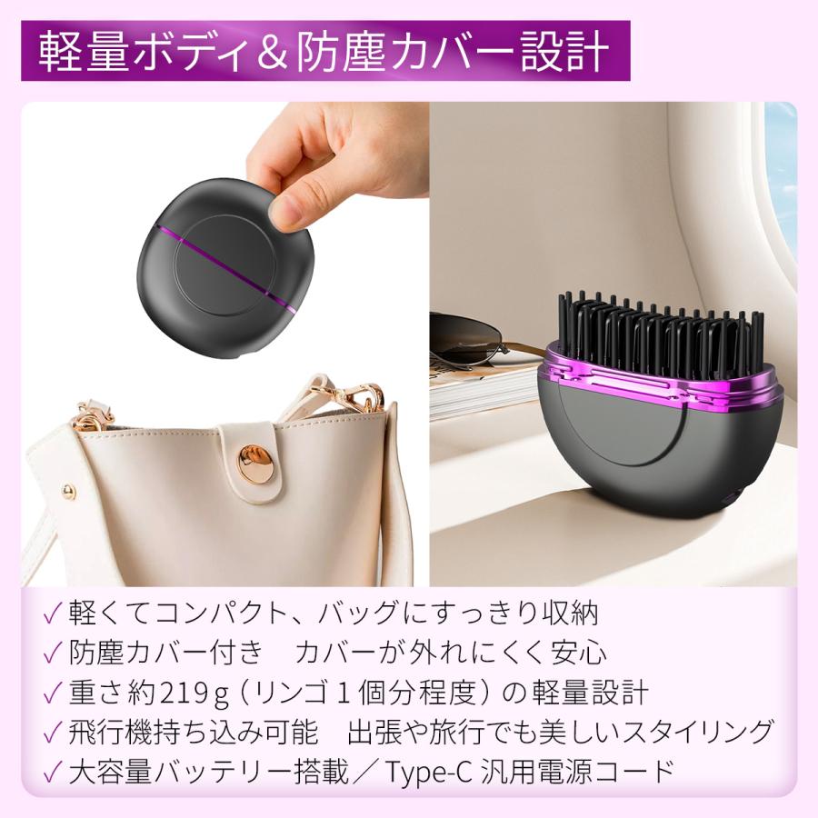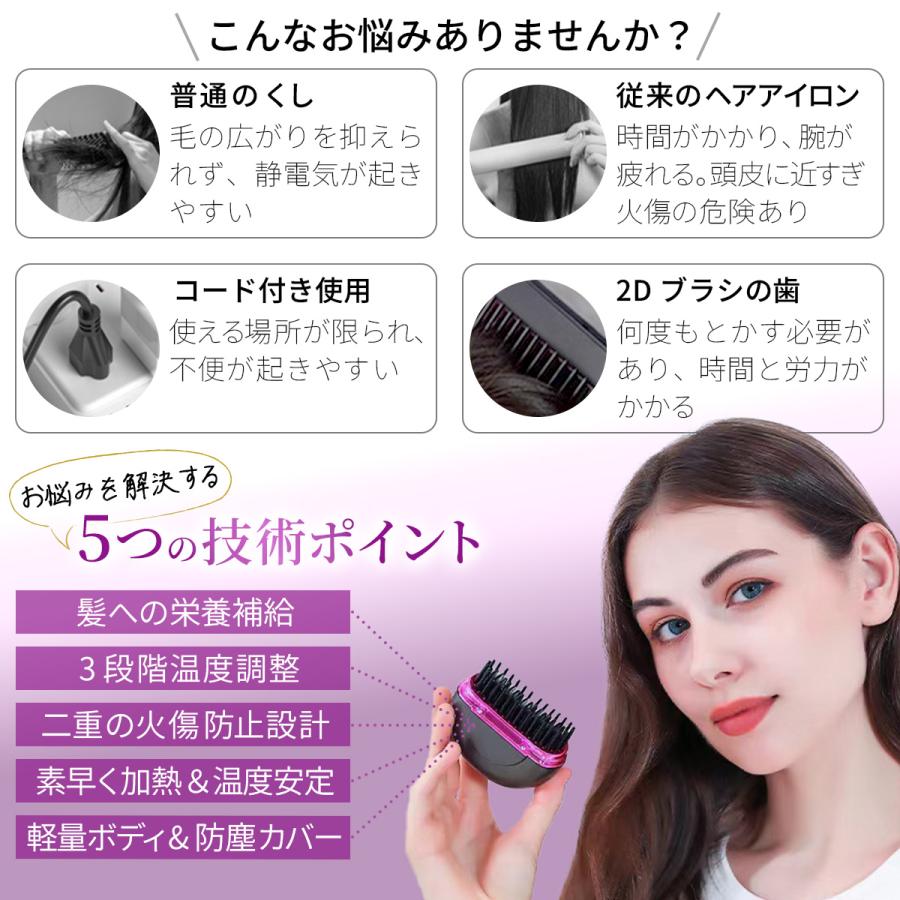 ヒートブラシ ミニ 簡単スタイリング ヘアアイロンブラシ コードレス 3段階温度調整 超軽量219g 携帯用 ポータブル 前髪 Type-C急速充電 3色 海外対応 持 ストレートブラシ
