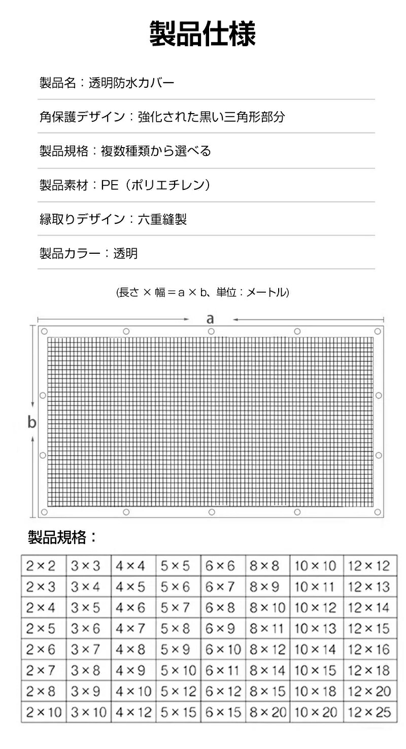 透明防水カバー 雨よけ 日よけシェード 200×200cm 200×300cm 200×400cm 200×500cm 200×600cm 200×800cm 200×1000cm 300×300cm 300×400cm 300×500cm 300×600cm 300×700cm 300×800cm 300×1000cm 400×400cm 400×500cm 400×600cm 400×800cm 400×1000cm 500×500cm 500×600cm 500×800cm 500×1000cm 600×600cm 600×700cm 600×800cm 600×1000cm