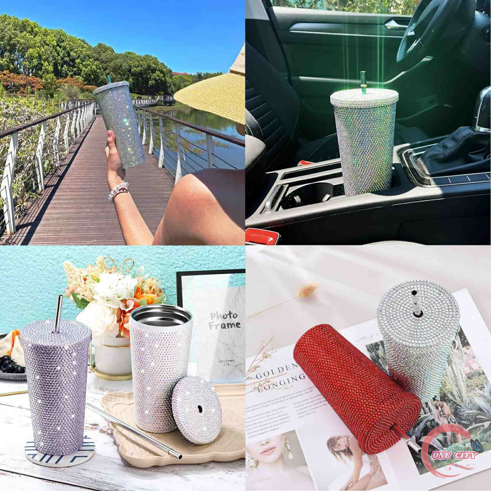 ダイヤモンド タンブラー 真空断熱 保冷 保温 ストロー付き 500ml マグ 水筒 キラキラ ステンレス ラインス スタッズ付き