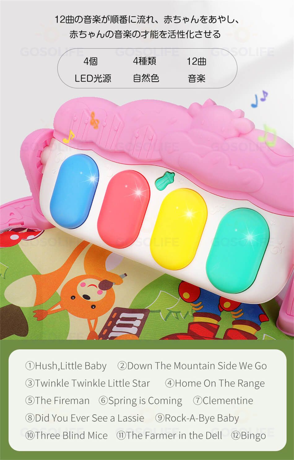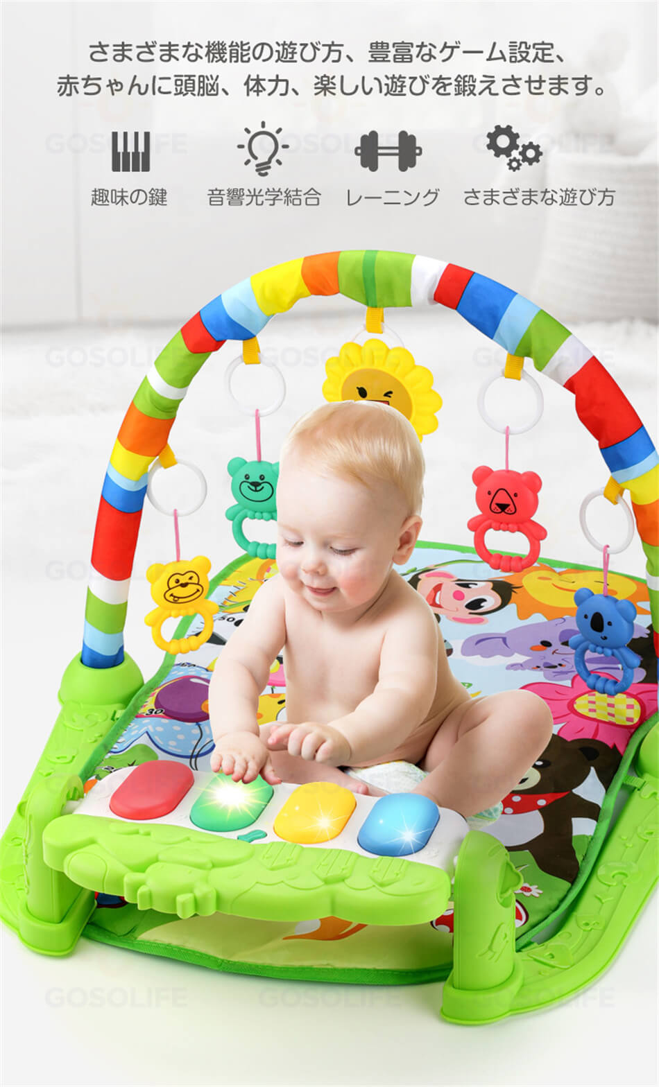 【取り外し可能なピアノのデザイン】 赤ちゃんのさまざまな姿勢に合わせてピアノの角度を調整できます。赤ちゃんがピアノの鍵盤を叩くと、点滅するライトが見え、美しいメロディーが聞こえ、感覚能力を発達させるために必要な聴覚と視覚の刺激が与えられます。このピアノプレイジムは赤ちゃんの好奇心を刺激し、世界への想像力を豊かにします。