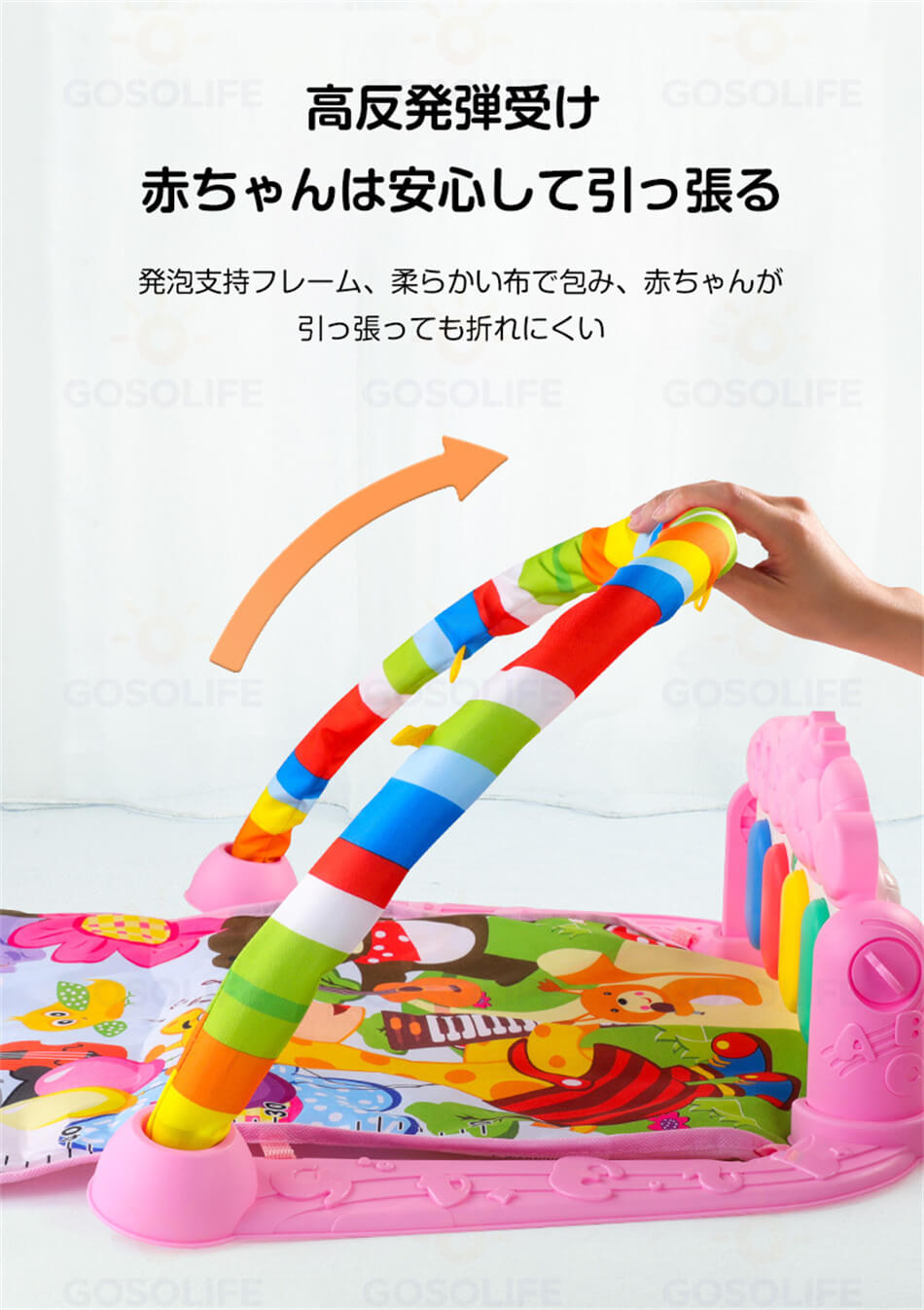 【安全で快適な肌触り】 ソフトで快適な肌触りです。ベビージムは高品質のコットンと生地で作られて、ABS環境保護材質で作られて、極厚で上質で滑らかな肌触りです。赤ちゃんの肌に安全で快適です。ベビープレイマットは洗濯機で洗え、お手入れも簡単で衛生的です。