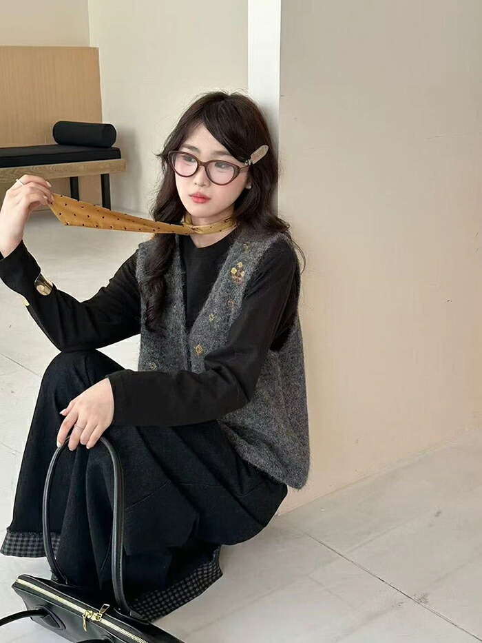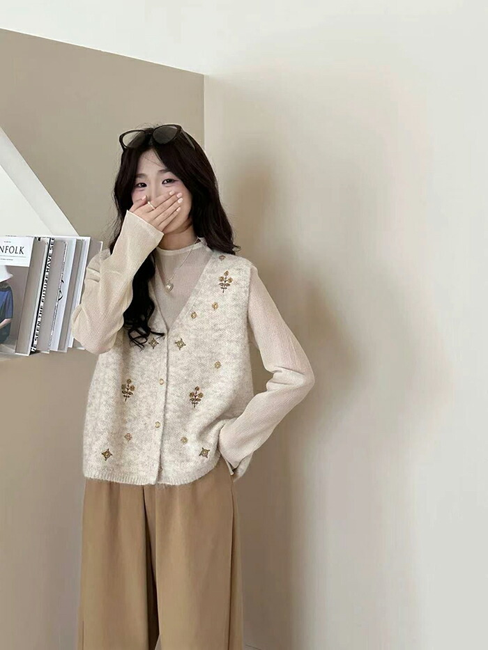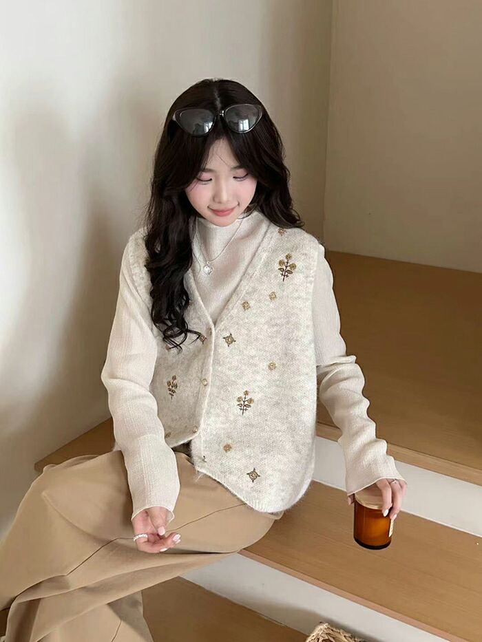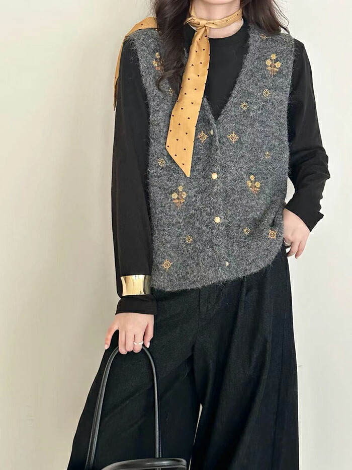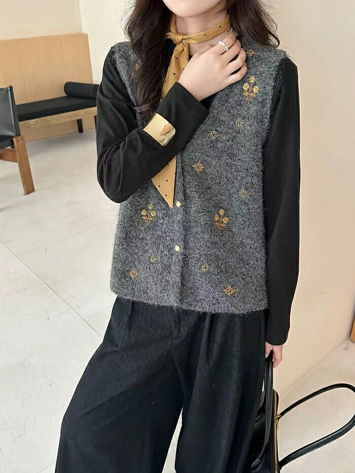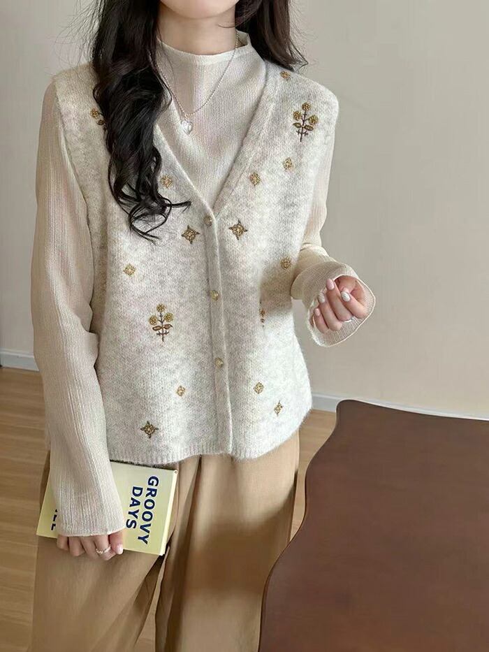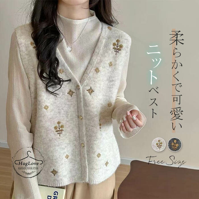 ニットベスト 前開きVネック 花柄刺繍 レディースファッション 早い者勝ち オフホワイト グレー
