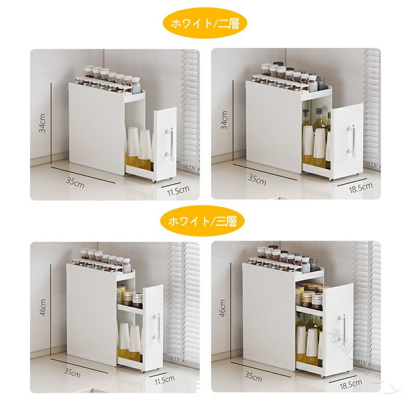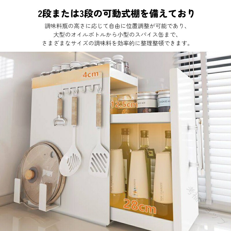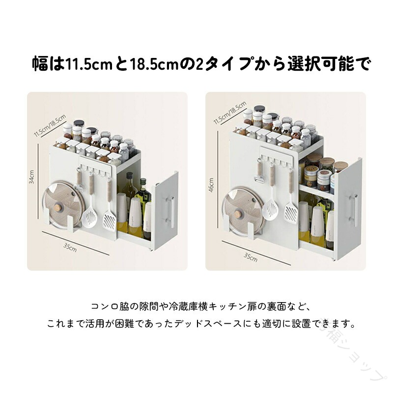 幅は11.5cmと18.5cmの2タイプから選択可能で、コンロ脇の隙間や冷蔵庫横、キッチン扉の裏面など、これまで活用が困難であったデッドスペースにも適切に設置できます。また、2段または3段の可動式棚を備えており、調味料瓶の高さに応じて自由に位置調整が可能であり、大型のオイルボトルから小型のスパイス缶まで、さまざまなサイズの調味料を効率的に整理整頓できます。