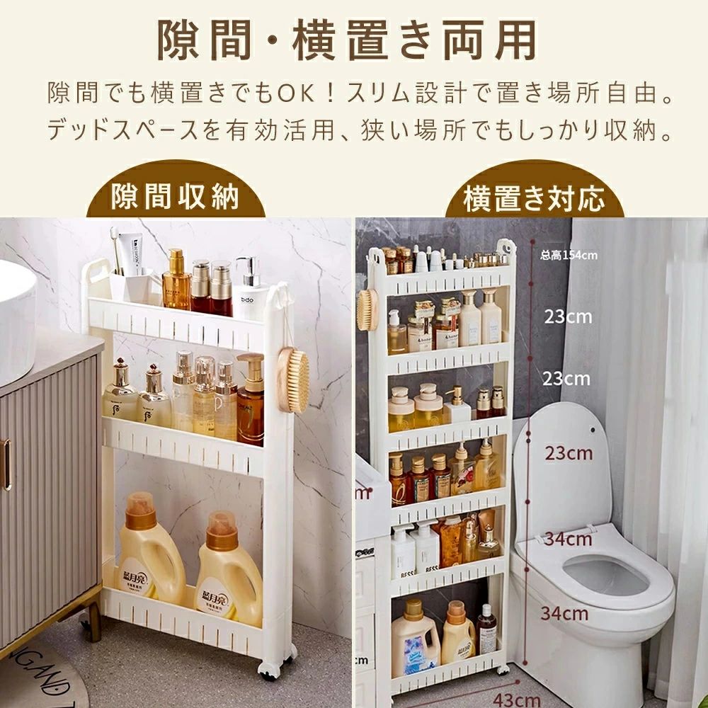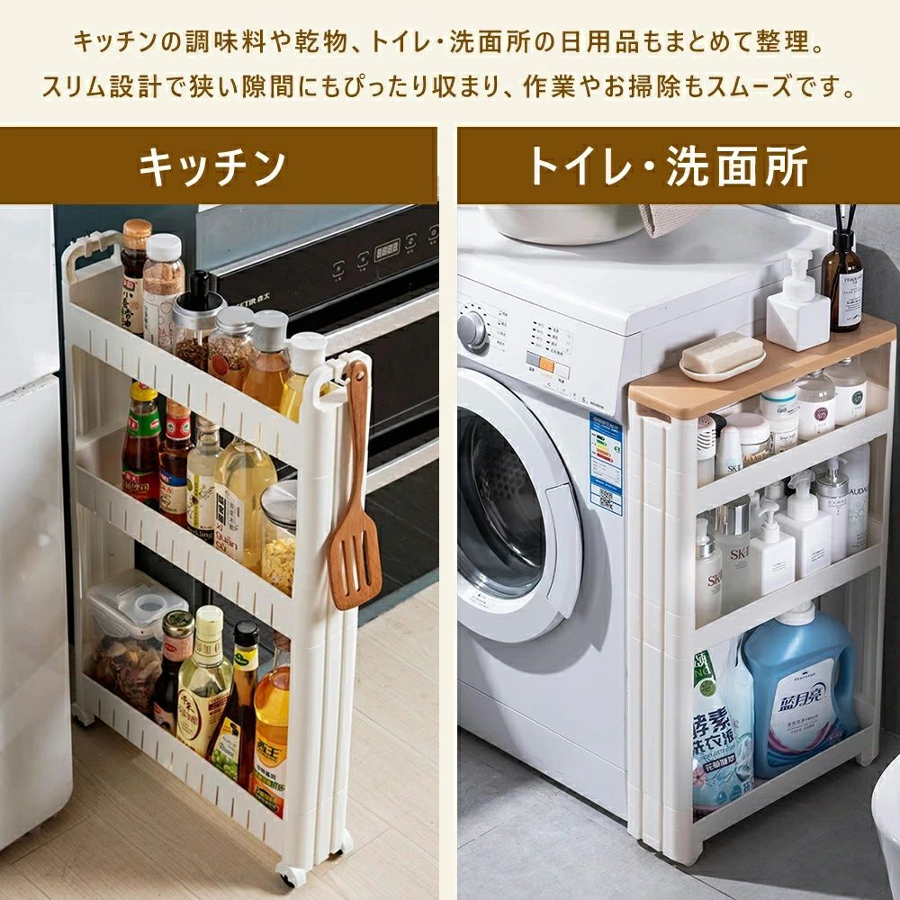 【色んな場面で大活躍 キッチン以外でも使え、色んな場所で大活躍します。洗面所ではランドリーや洗面の隙間の収納、トイレではペーパーホルダーラックとしても使えます。プラスチック製で水に濡れてもすぐにふき取ることができるので、お掃除も簡単です。また、リビングなどでは壁面に沿わせて収納することもできます。