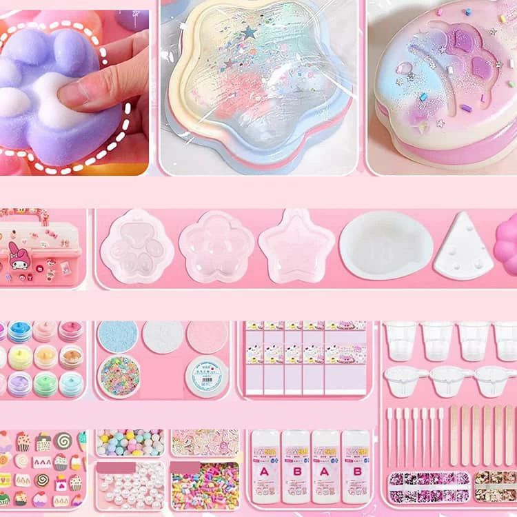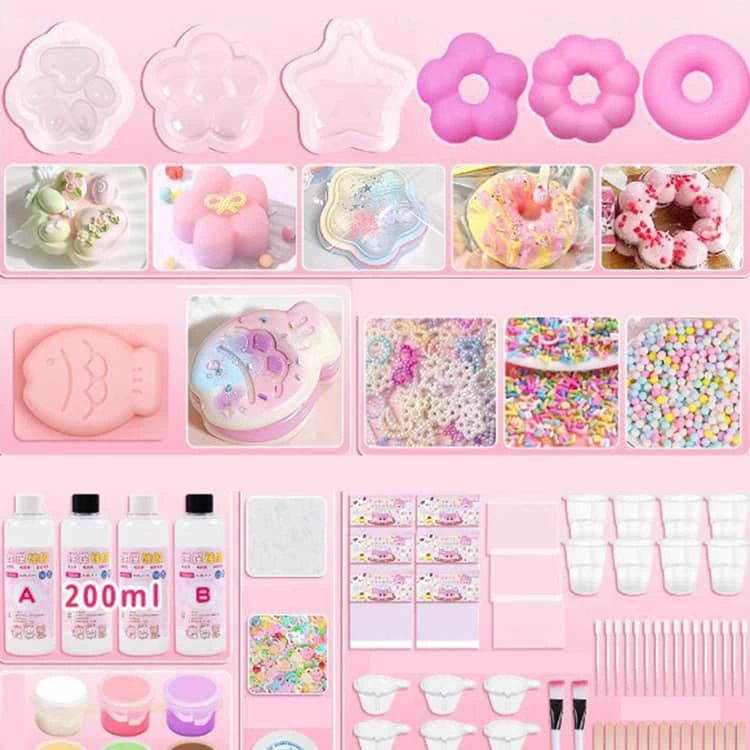 【セット内容】収納ケース、シリコンモールド×6、スクイーズジェルA・B 各200ml、スクイーズ用着色剤×6(※色はランダム)、パールリボン×20、飾りボール×2、EVA袋×10、ジッパー袋×2、カップ×2、30ml用計量カップ×10、ブラシ×1、かき混ぜ棒×10、ワセリン、スポイト×3、フロッキングパウダー、スパンコール