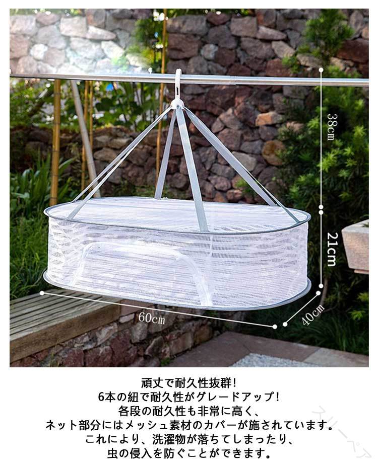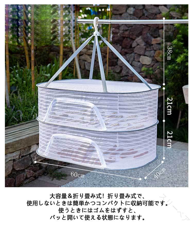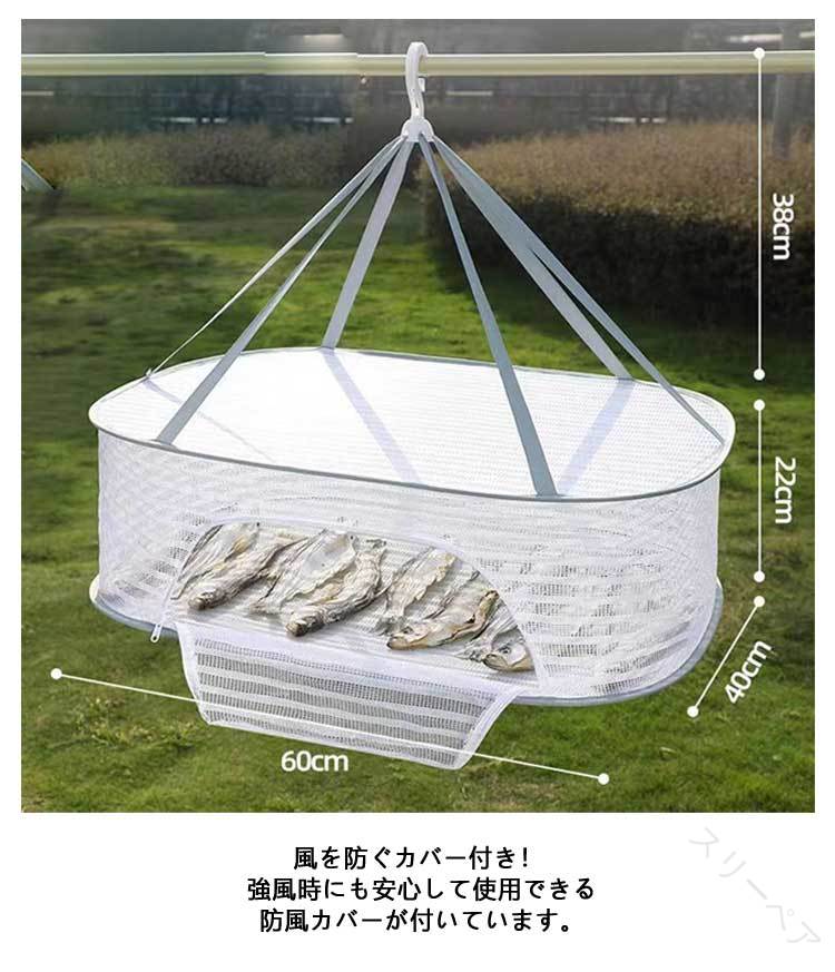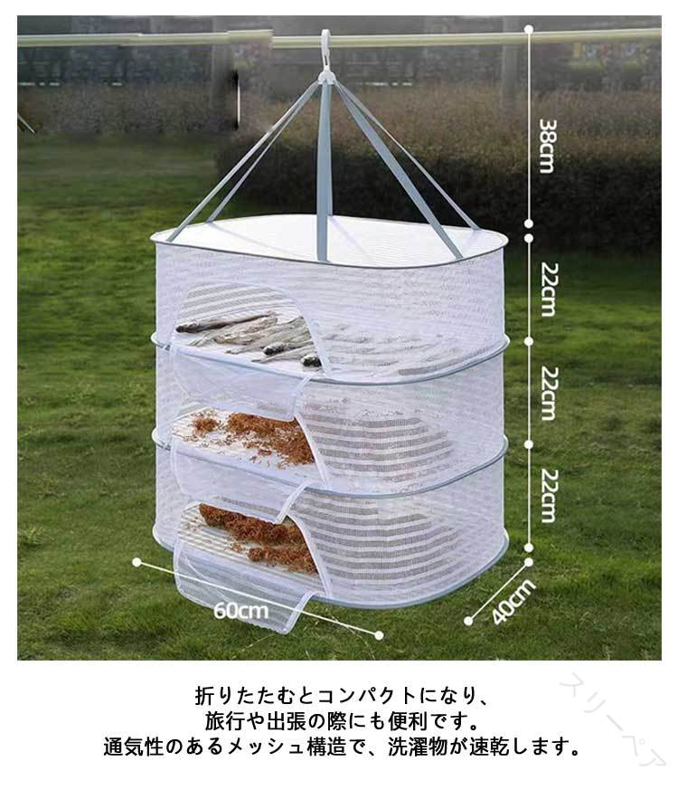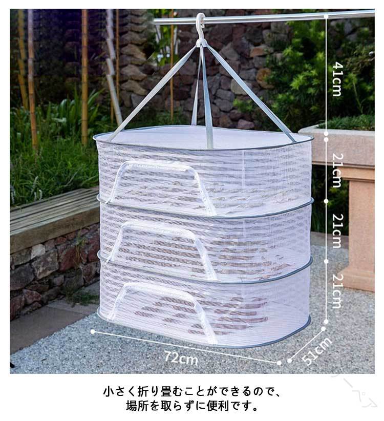 多機能!魚、野菜、梅、芋、 ハープの速乾に最適です。また、ブラジャー、下着、編み物、セーター、ぬいぐるみの干しにも役立ちます。特におしゃれ着やぬいぐるみ、枕などを平干しすることで、型崩れを防止します。虫の侵入も防ぎ、安心してご使用いただけます。風を防ぐカバー付き! 強風時にも安心して使用できる防風カバーが付いています。トップには防風フックが設計されていて、プライバシーも保護されるので、下着類の干しでも心配ありません。折りたたむとコンパクトになり、旅行や出張の際にも便利です。通気性のあるメッシュ構造で、洗濯物が速乾します。頑丈で耐久性抜群!6本の紐で耐久性がグレードアップ!各段の耐久性も非常に高く、ネット部分にはメッシュ素材のカバーが施されています。これにより、洗濯物が落ちてしまったり、虫の侵入を防ぐことができます。大容量&折り畳み式!折り畳み式で、使用しないときは簡単かつコンパクトに収納可能です。使うときにはゴムをはずすと、パッと開いて使える状態になります。小さく折り畳むことができるので、場所を取らずに便利です。ファスナーが付いているため、ぬいぐるみなどが落ちる心配がありません。安心して干せる設計です。使用シーン!ぬいぐるみ、ニット、下着、梅干し、干し野菜作り、魚干し、干し芋、ハープ、ドライフルーツなど、様々な場面で活躍します。生活のあらゆるシーンで便利に使える「多機能物干しネット」で、日々の家事をもっと快適にしましょう。