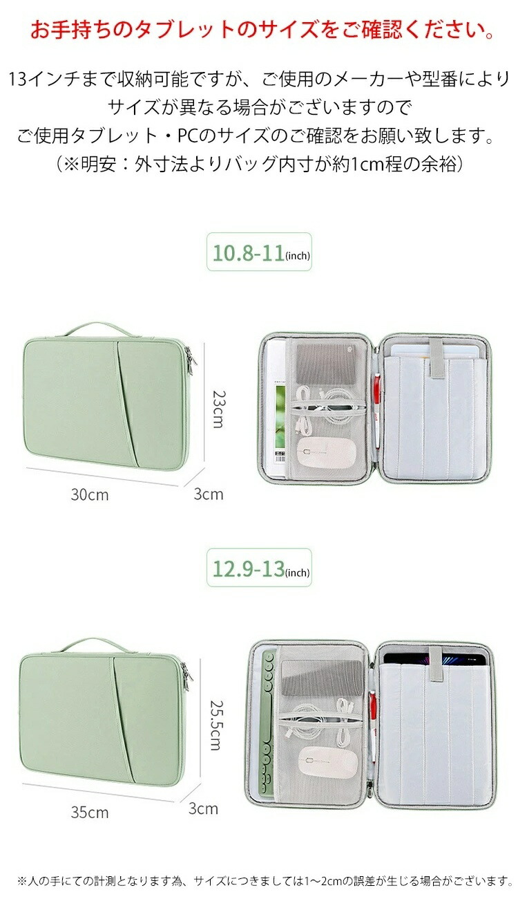 13インチまで収納可能ですが、ご使用のメーカーや型番によりサイズが異なる場合がございますのでご使用タブレット・PCのサイズのご確認をお願い致します。