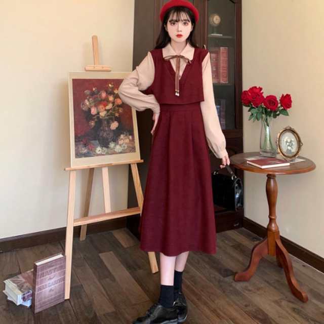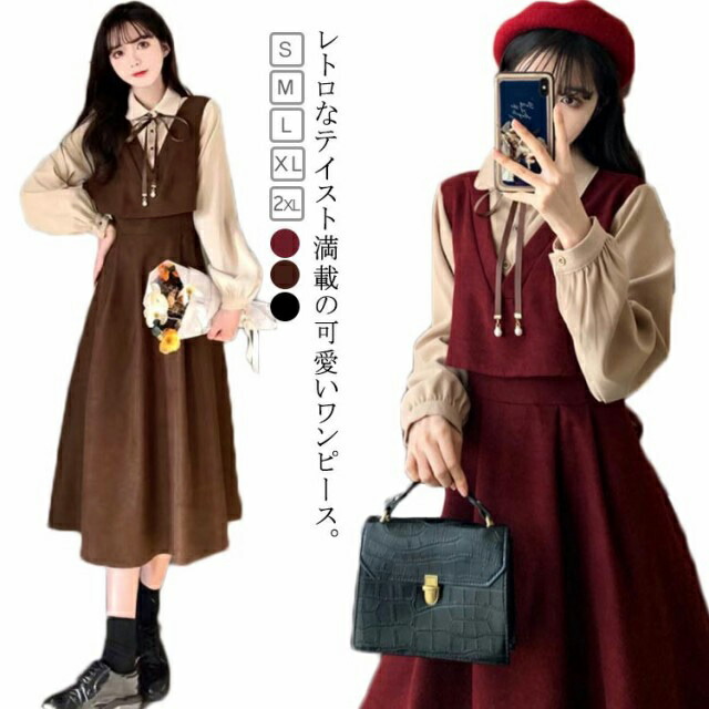 ワンピース レディース 春 重ね着風 レディースファッション 続々登場 ブラウン ワインレッド ブラック S M L XL 2XL