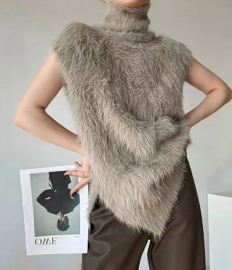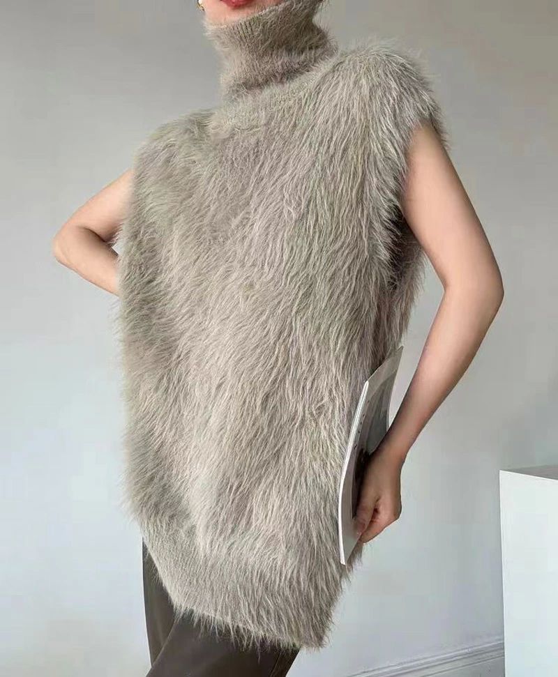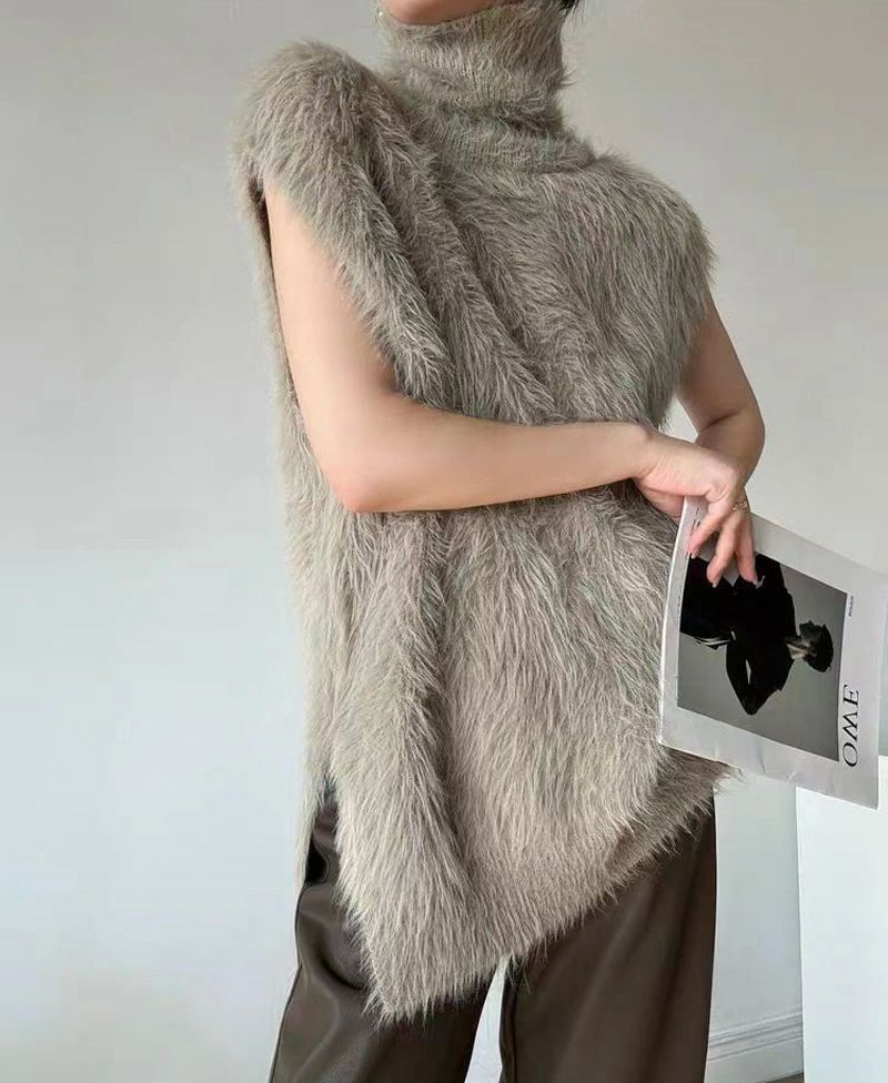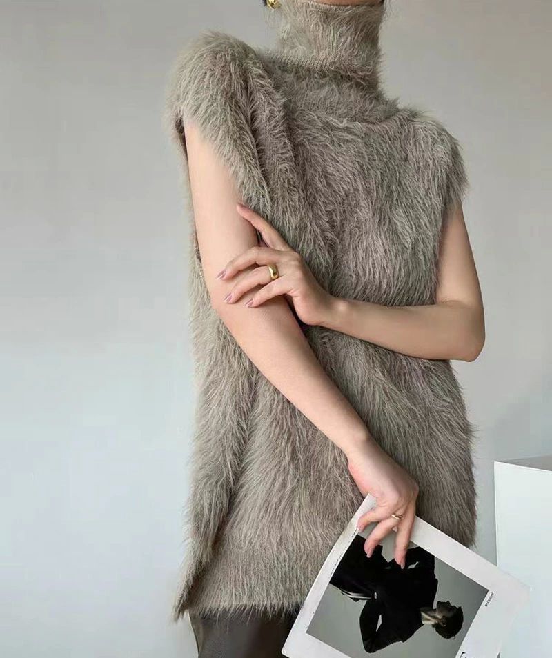 ハイネック ニットベスト シャギー レ トップス ベスト 豊富な品揃え カーキ ブラック ホワイト ダークグレー