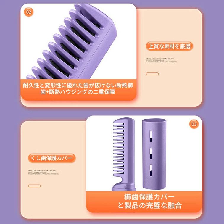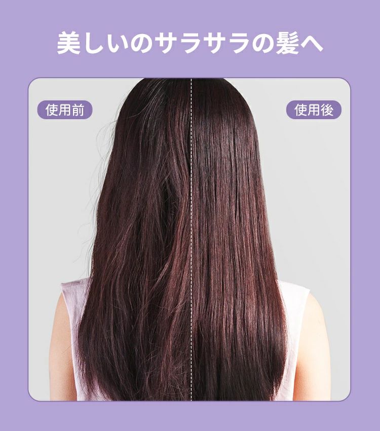 安全性アップ。ブラシの外周、ブラシ先端部分に耐熱素材を使用、高温でも地肌を守れます。温度が上がった状態でもブラシの赤い部分があるため、万が一手で握ってしまったり 触れてしまっても、その部分は熱くないので火傷の心配もありません。30分経過すると自動で電源がオフになる安全機能付いています。毛先をキャッチしやすいブラシ設計。絹のように美しく輝く髪を実現する、より繊細な頭皮をダメージから守る。特製ブラシによって頭皮の血行がよくなり、髪に輝き、柔らかさ、そして弾力性を与える効果があります。