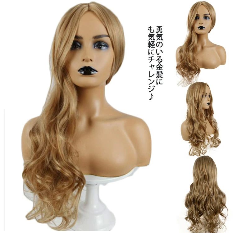 イベ パーティー ライブ コスプレ ハロウィン 変装 仮装 かつら つけ毛 前髪なし ロング フルウィッグ ゆるカール 金髪 ウェーブ