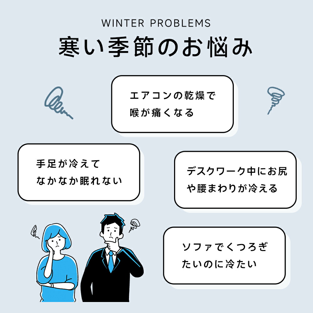 :手足が冷えて眠れない/デスクワーク中にお尻や腰が冷える/エアコンの乾燥が苦手/ソファでくつろぎたいのに冷たい…