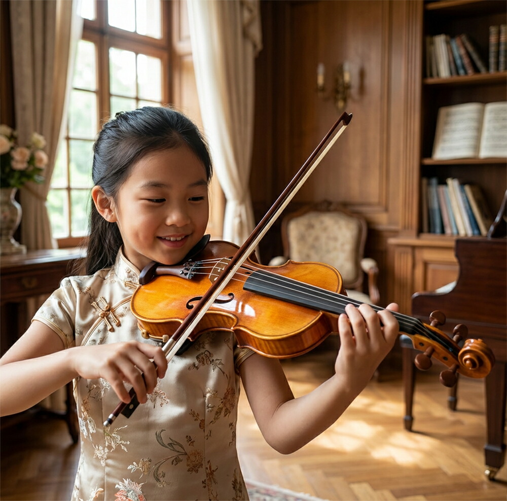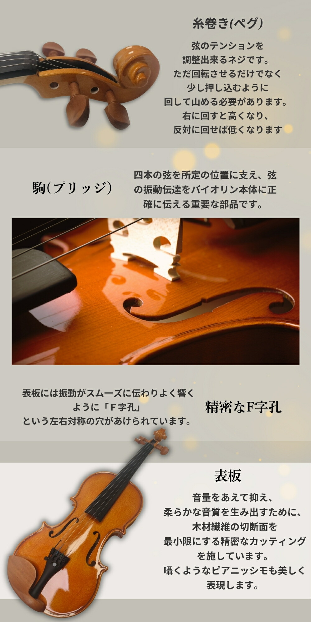 厳選されたスプルース材とメイプル材で作られたヴァイオリンは、低音の響きが深くなり、高音もより豊かで明るい音色を持っています。