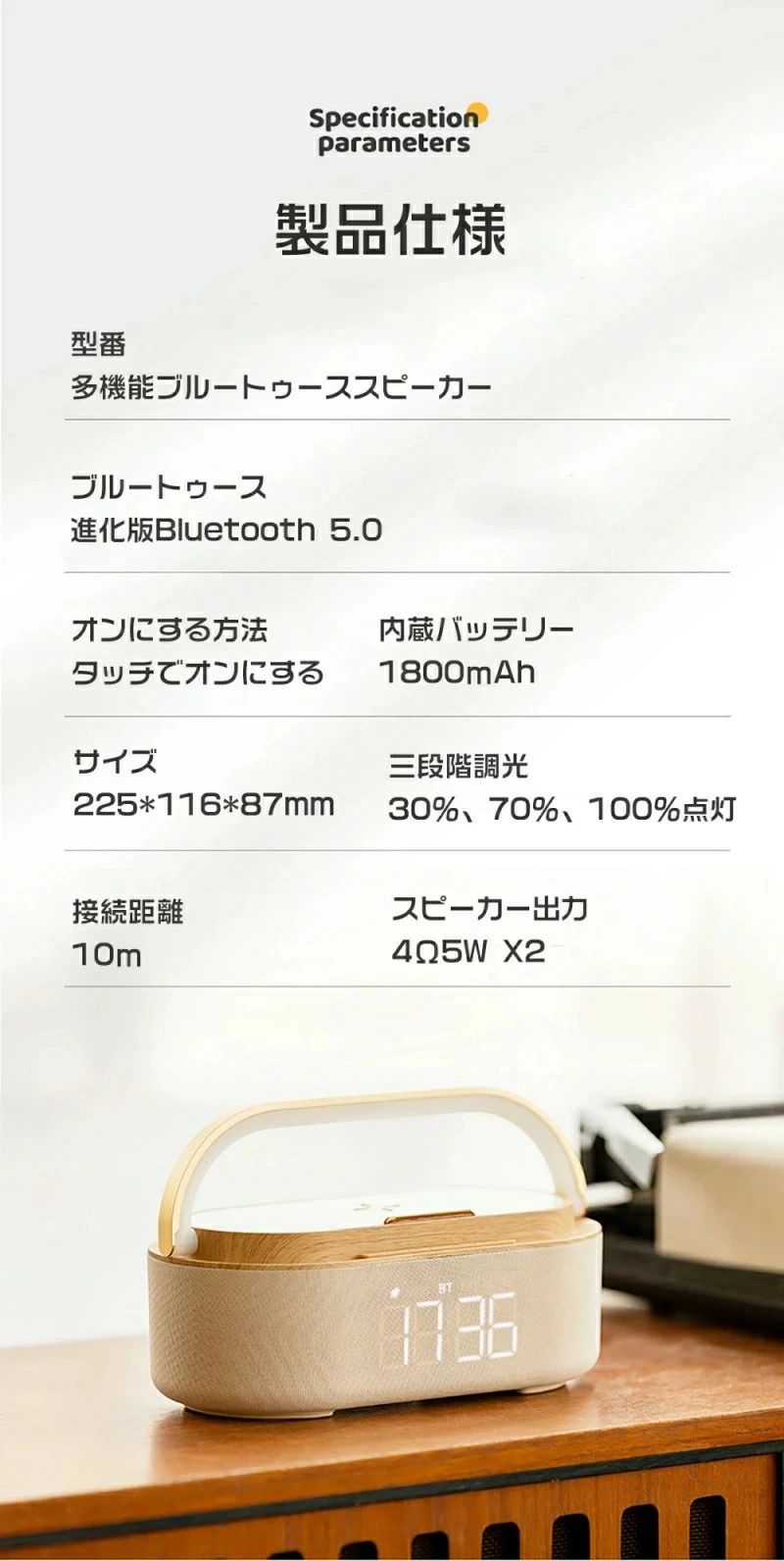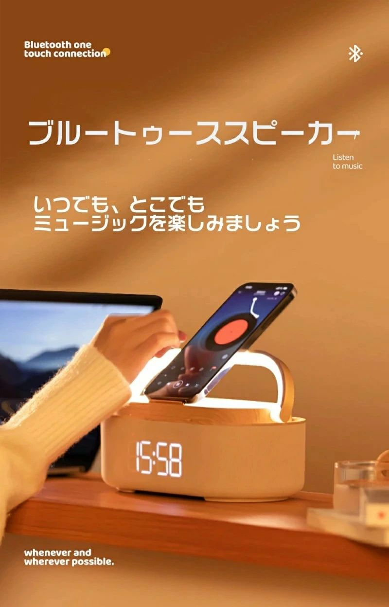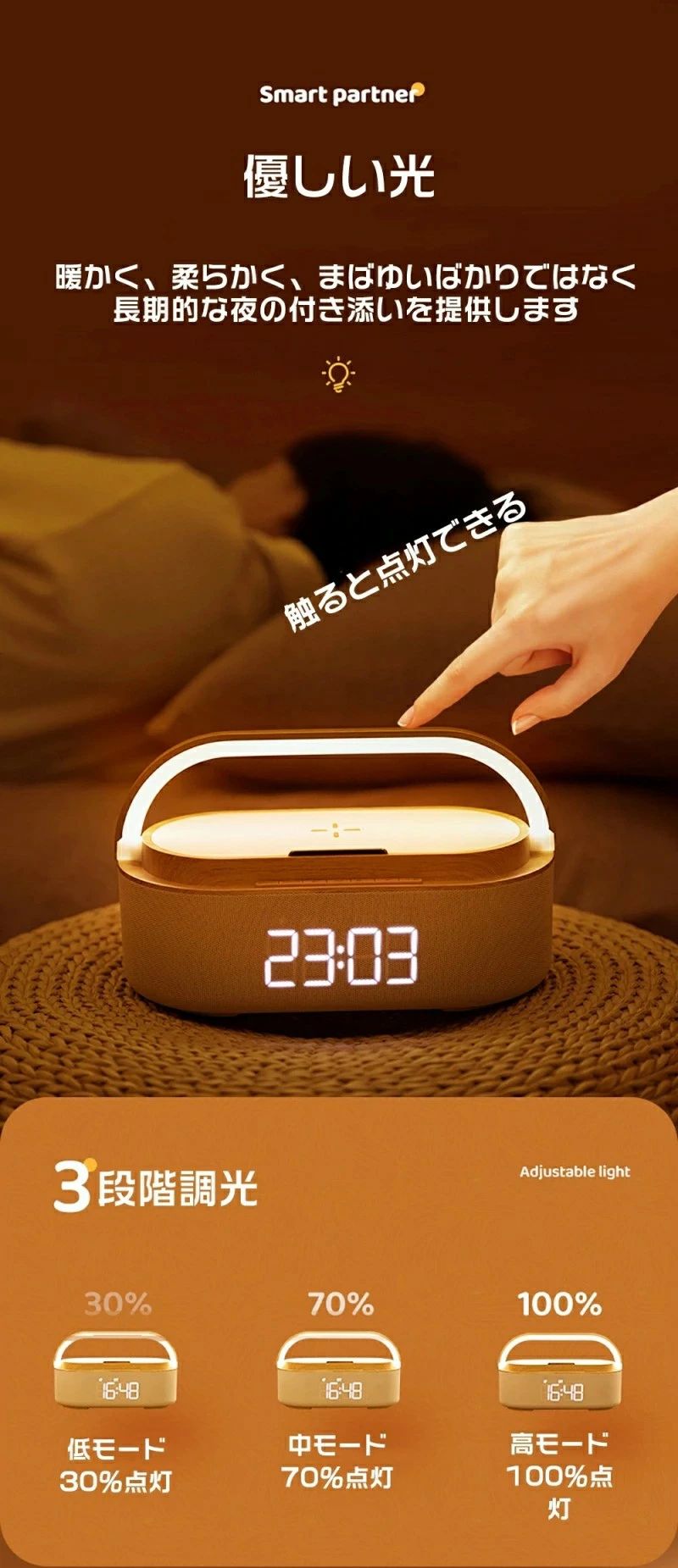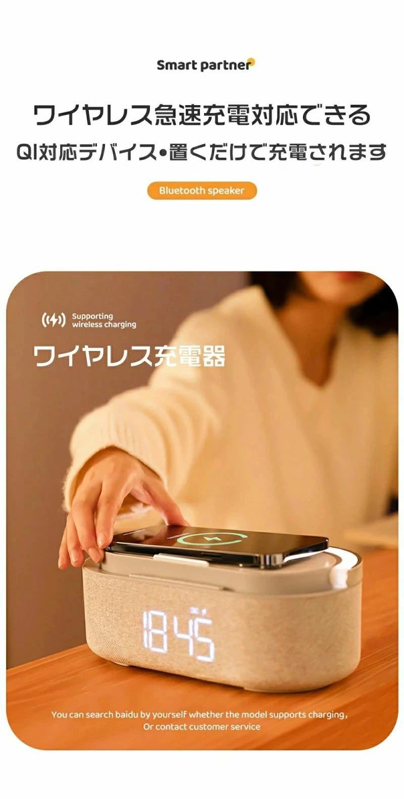 ワイヤレス充電器 Bluetoothスピーカー ワイヤレススピーカー 多機能搭載 目覚まし時計 ナイトライトBluetooth5.0 1800mAhリチ FMラジオ