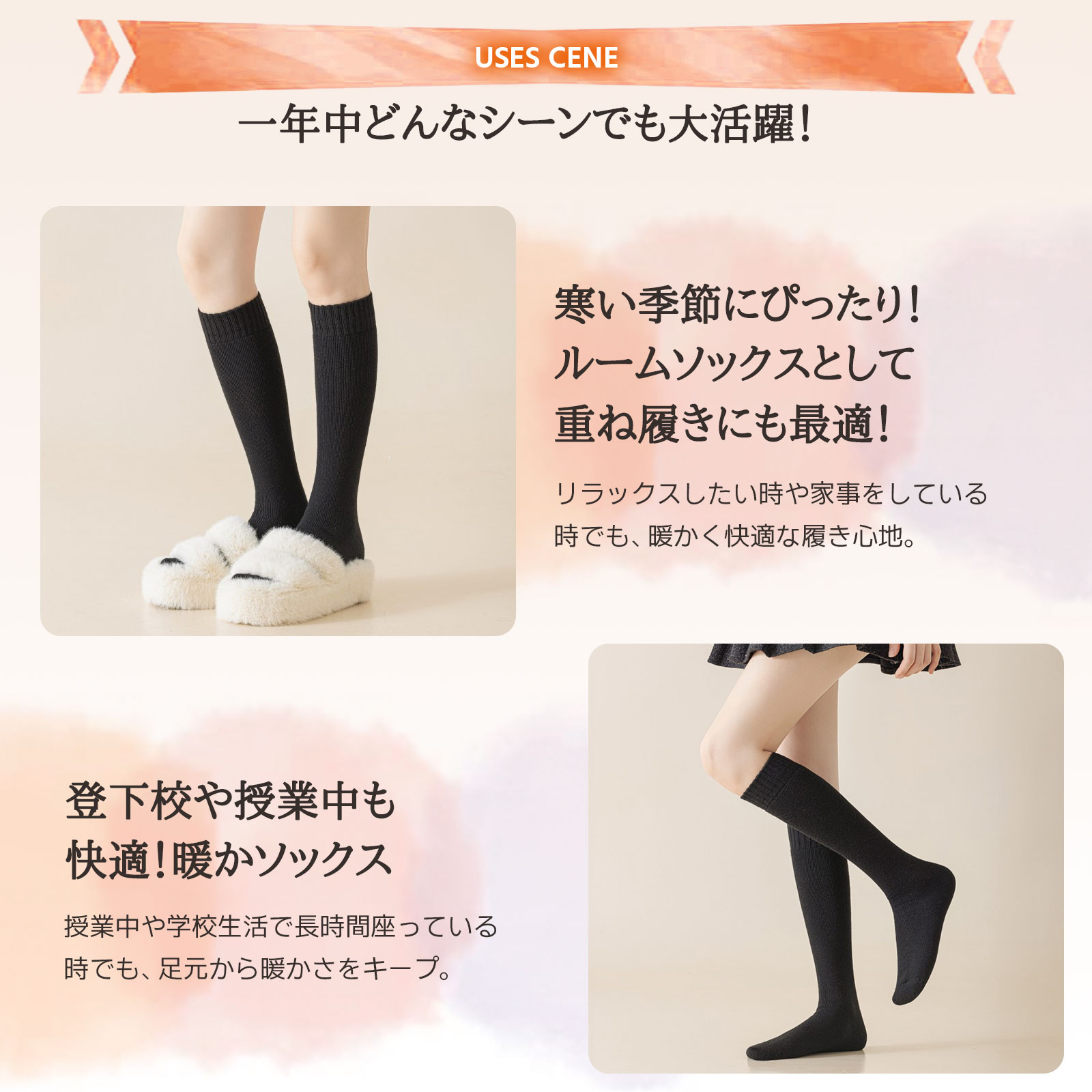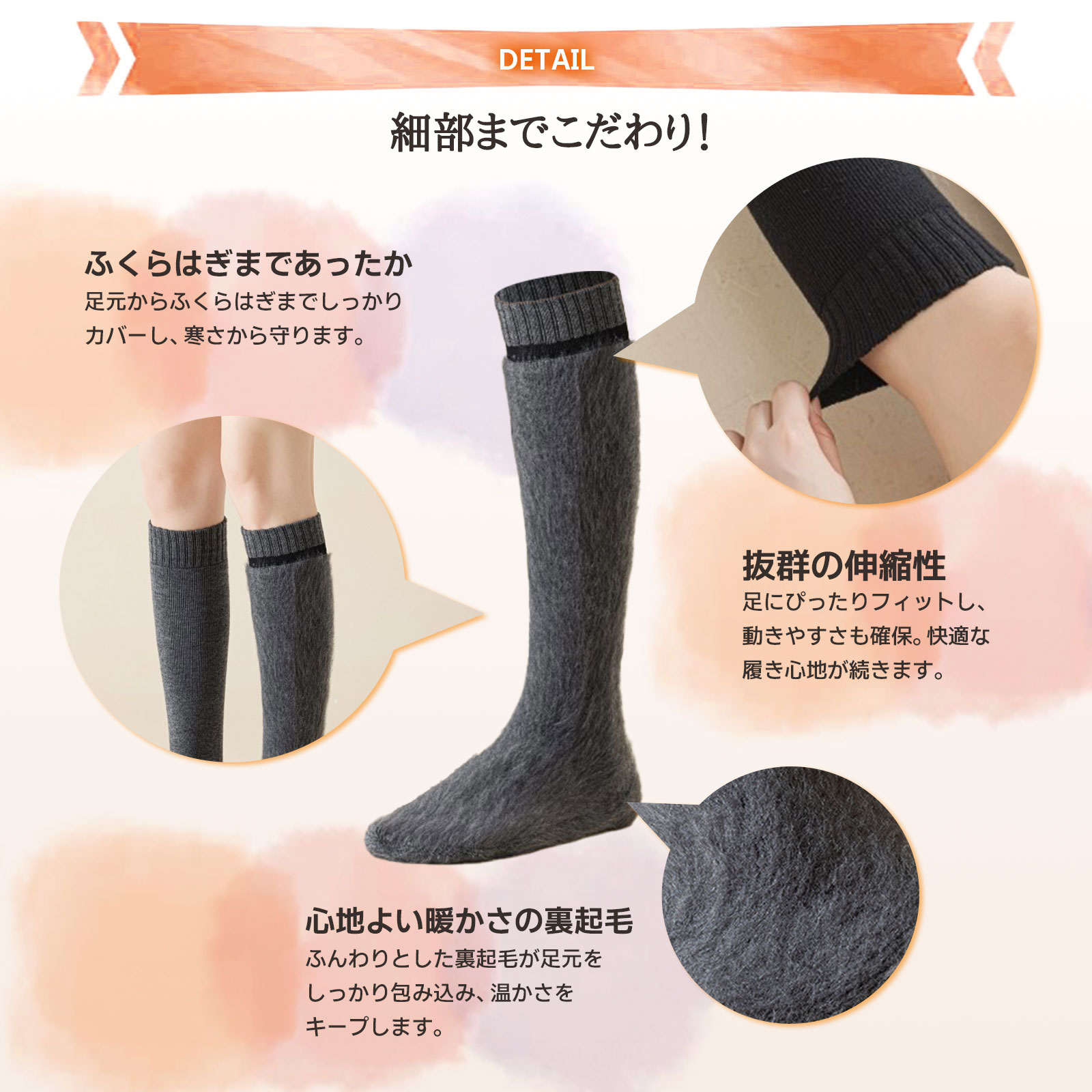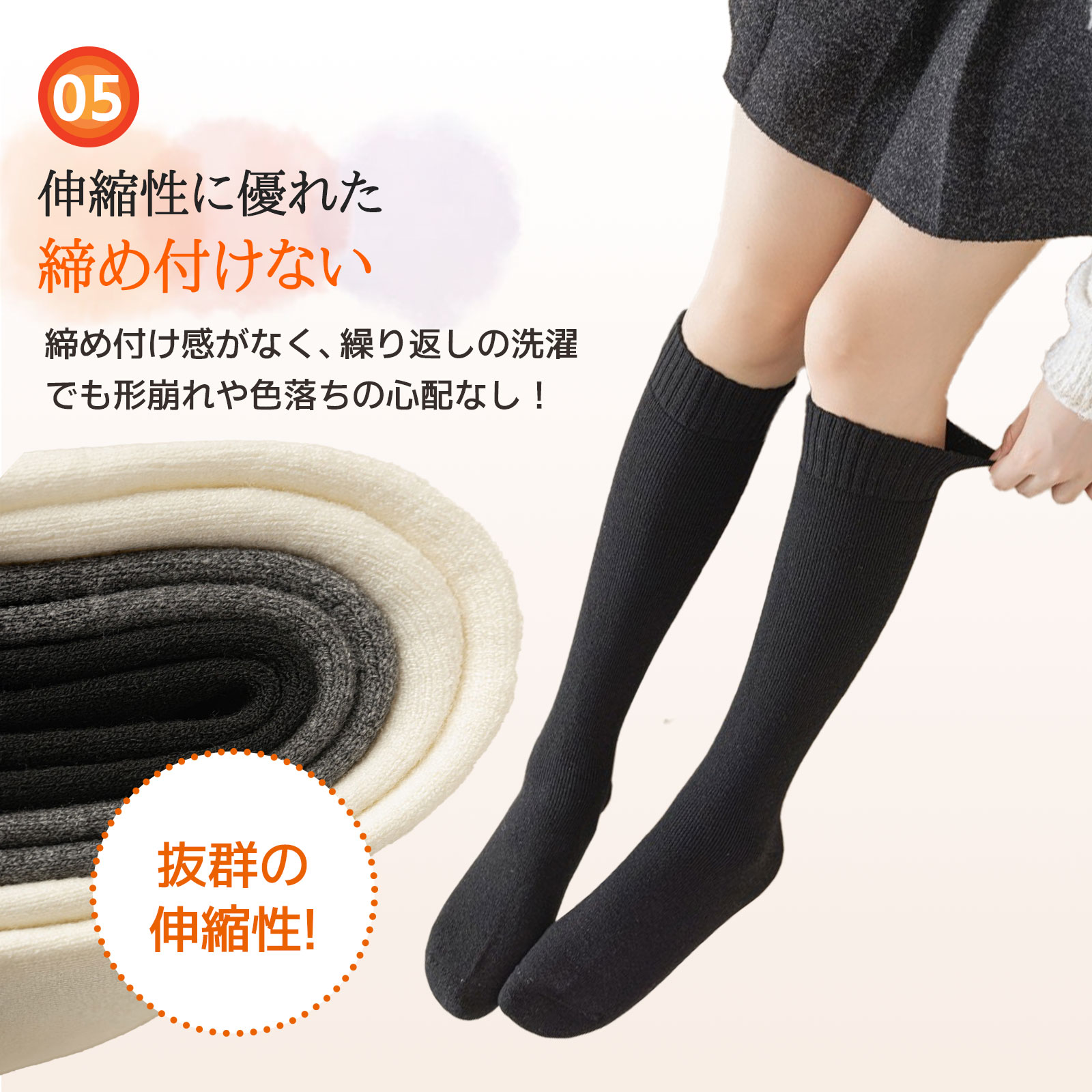 【快適フィット設計】 抜群のストレッチ性で足にぴったりフィット。窮屈感のない快適な履き心地と、ズレ落ちにくいリブ仕様の袖口で、一日中ストレスフリー。
