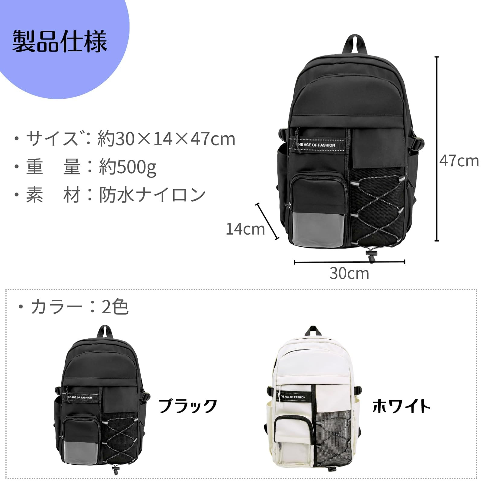 素材:防水ナイロン カラー:ブラック / ホワイト 重量:約g 容量:大容量(Aサイズ・インチPC収納対応) 特徴:透明ポケット付き、複数ポケットあり、軽量設計、防水仕様 用途:推し活、通勤・通学、旅行、日常のおでかけ