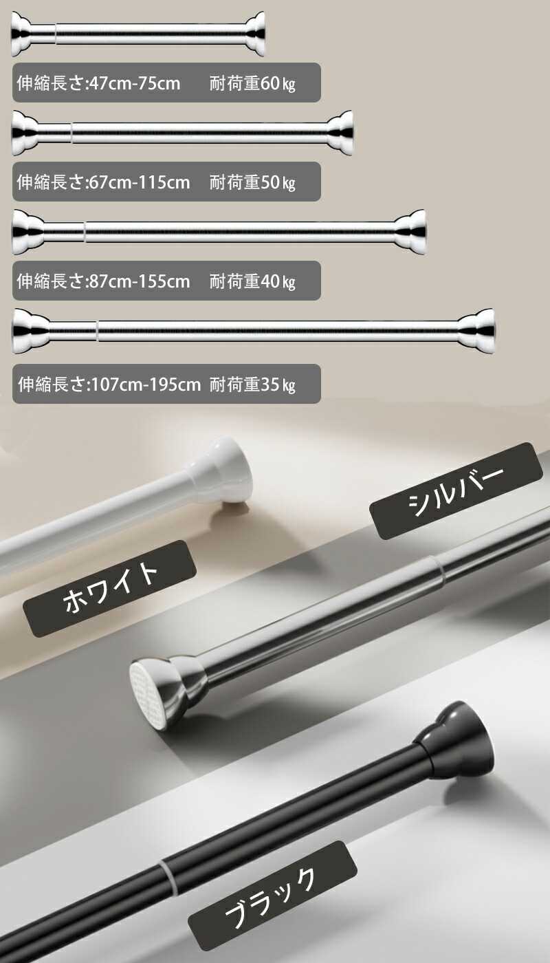 突っ張り棒 強力 伸縮ポールつっぱり棒 S(伸縮範囲約47cm~75cm) M(伸縮範囲約67cm~115cm) L(伸縮範囲約87cm~155cm) XL(伸縮範囲約127cm~225cm) シルバー(ステンレス製) ホワイト ブラック