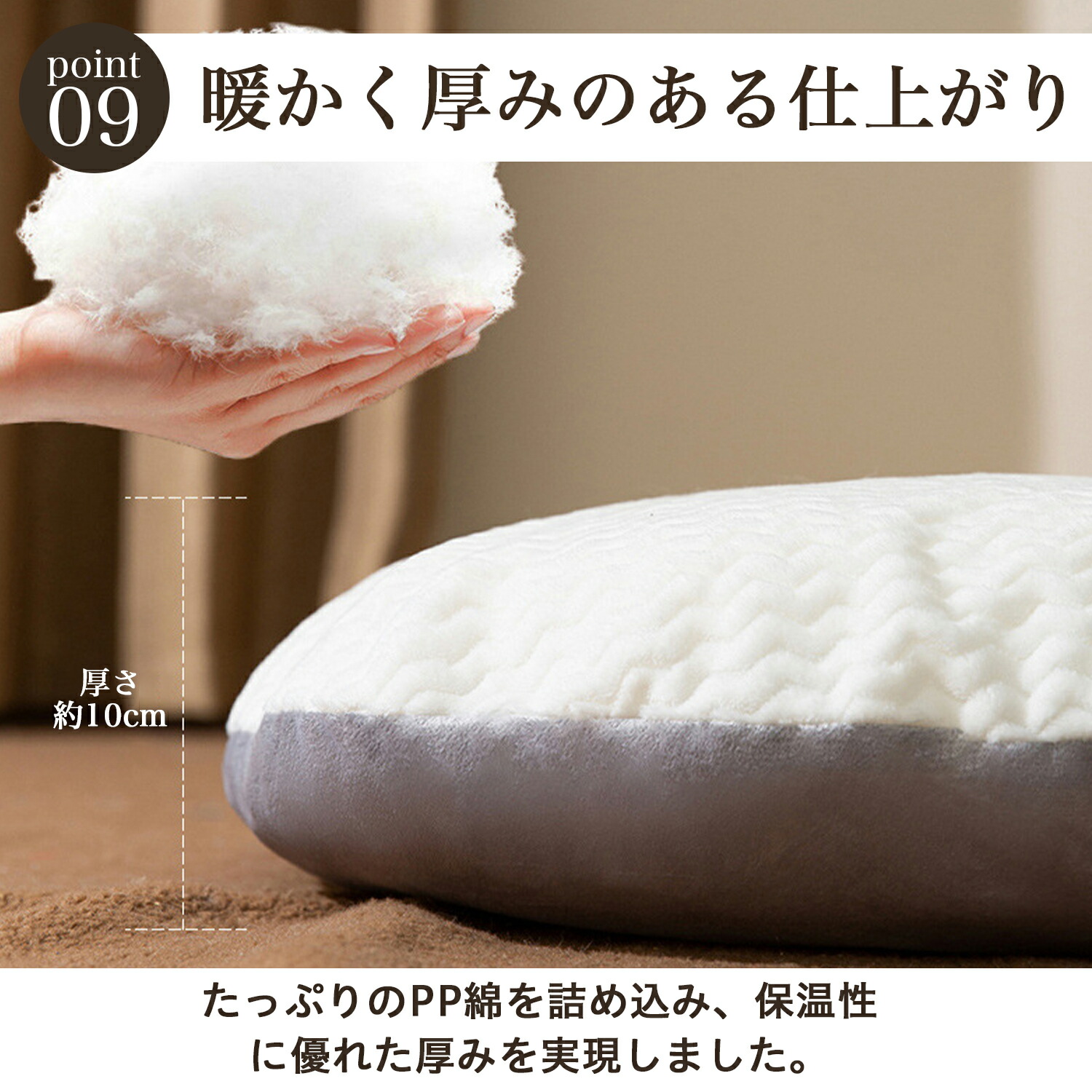 └ 厚み約8~10 cm、優れたクッション性と保温性。へたりにくく長く使える。