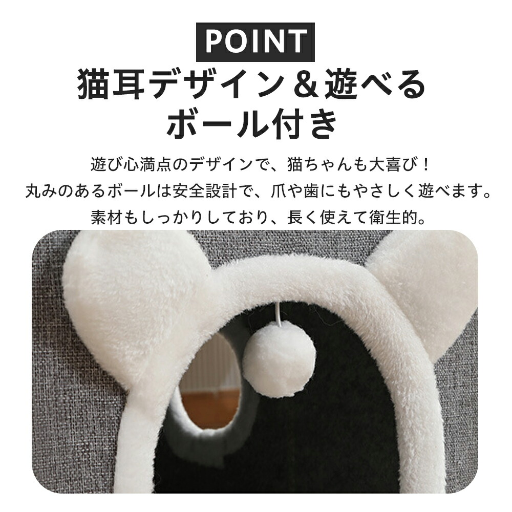 出入り口にはふわふわの縁取りと揺れるボール付きで、猫の好奇心をくすぐります。