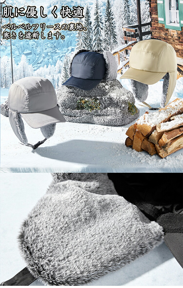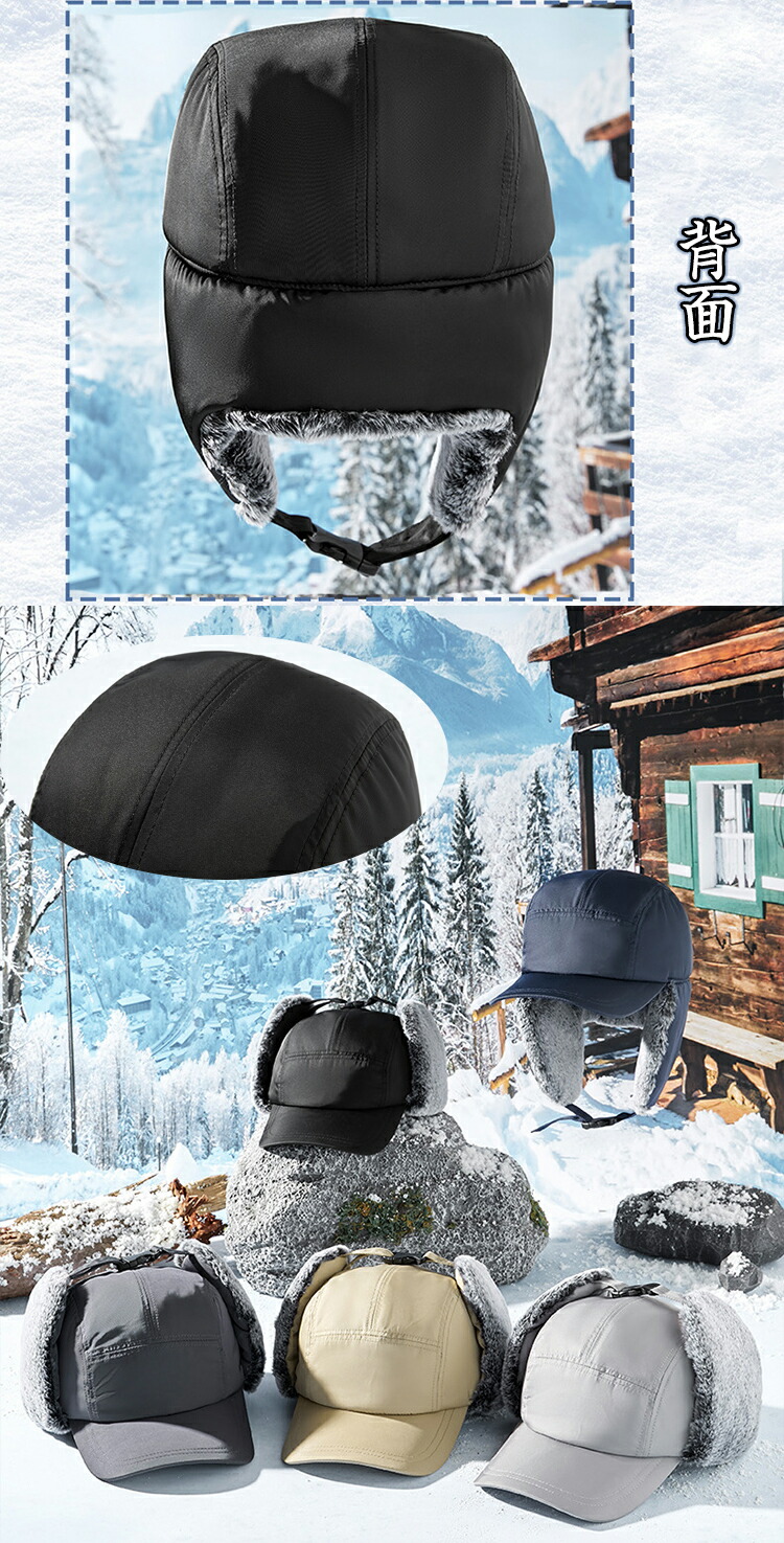 【防風の暖かい耳あて&あご紐】フェイクファーの折りたたみ&プルダウン式サイドフラップ、あご紐は保温に便利です。 自転車に乗っているときでも、風で帽子が吹き飛ば されることを防ぐことができます。