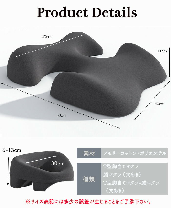 種類:T型胸当て枕・顔枕(穴あき)・T型胸当て枕+顔枕(穴あき)