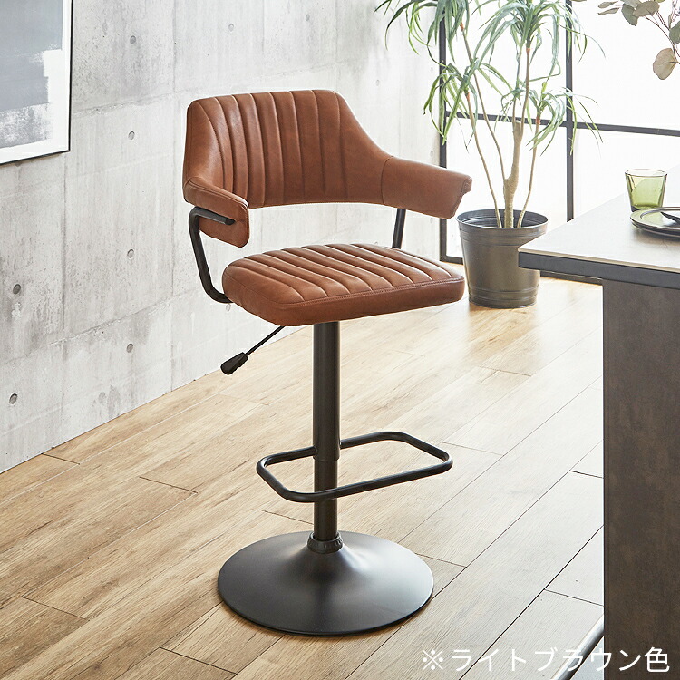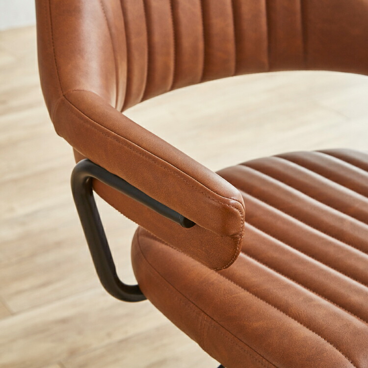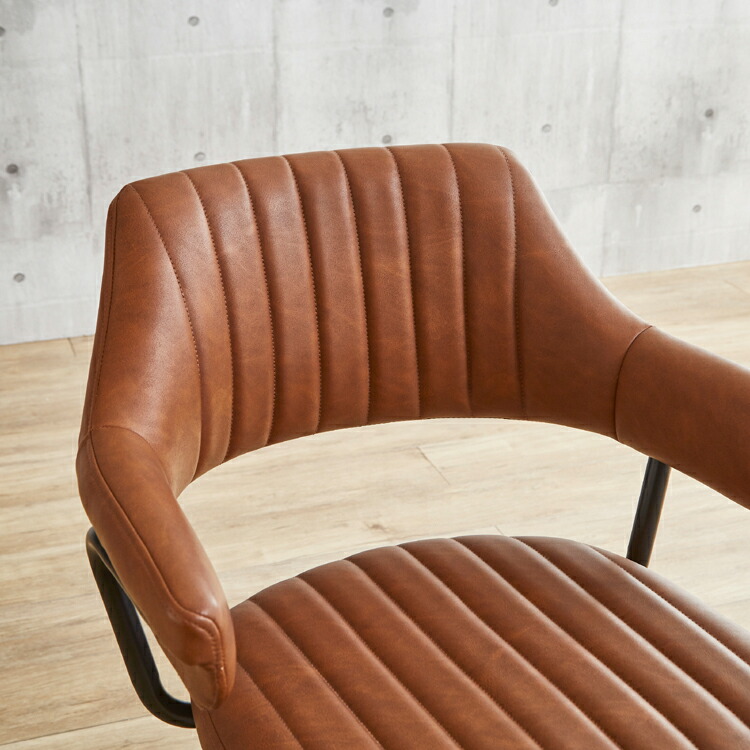映画のワンシーンで見たような、レトロなデザインが目を引く肘付きのカウンターチェア。背もたれと肘が一体となった座面は身体のラインに合わせて緩やかにカーブ。身体を包み込むようにフィットし、快適な座り心地となっています。張地にはヴィンテージ調のPUレザー(合成皮革)を使用しており、座面・背もたれ・肘部分はウレタンフォーム入りで長時間座っても疲れにくくなっています。座面はガス圧昇降タイプで座面高57~79cmまでの調節ができ、立ち座りの動作がスムーズに行える360度回転式。脚部はデザインを引き締めるブラック色のスチール製を採用。ライトブラウン、クリームの2色よりお選び頂けます。