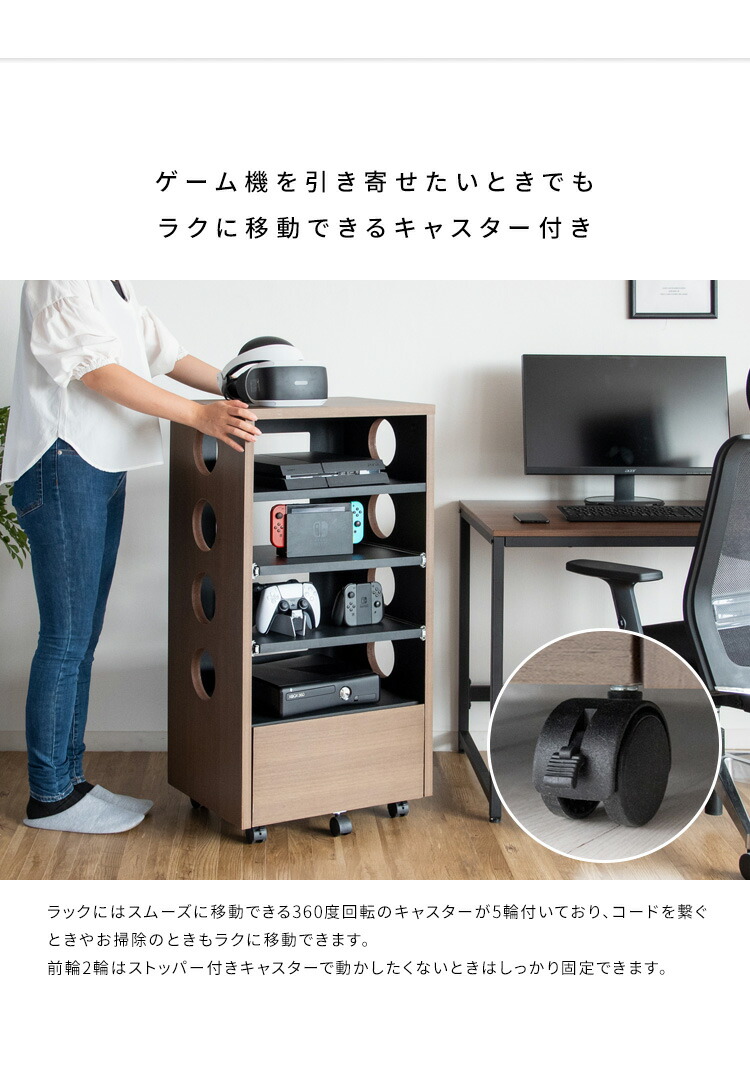 ゲーム機収納 ラック ルーター収納 おしゃれ ps5 switch スイッチ 収納棚 木製 キャスター付き ゲーミングラック ゲーム機ラック ゲームソフト ヘッドセット 隙間収納 スリ コントローラー