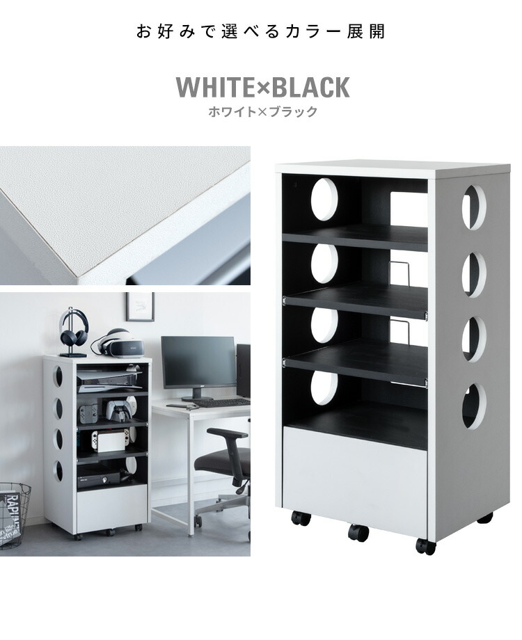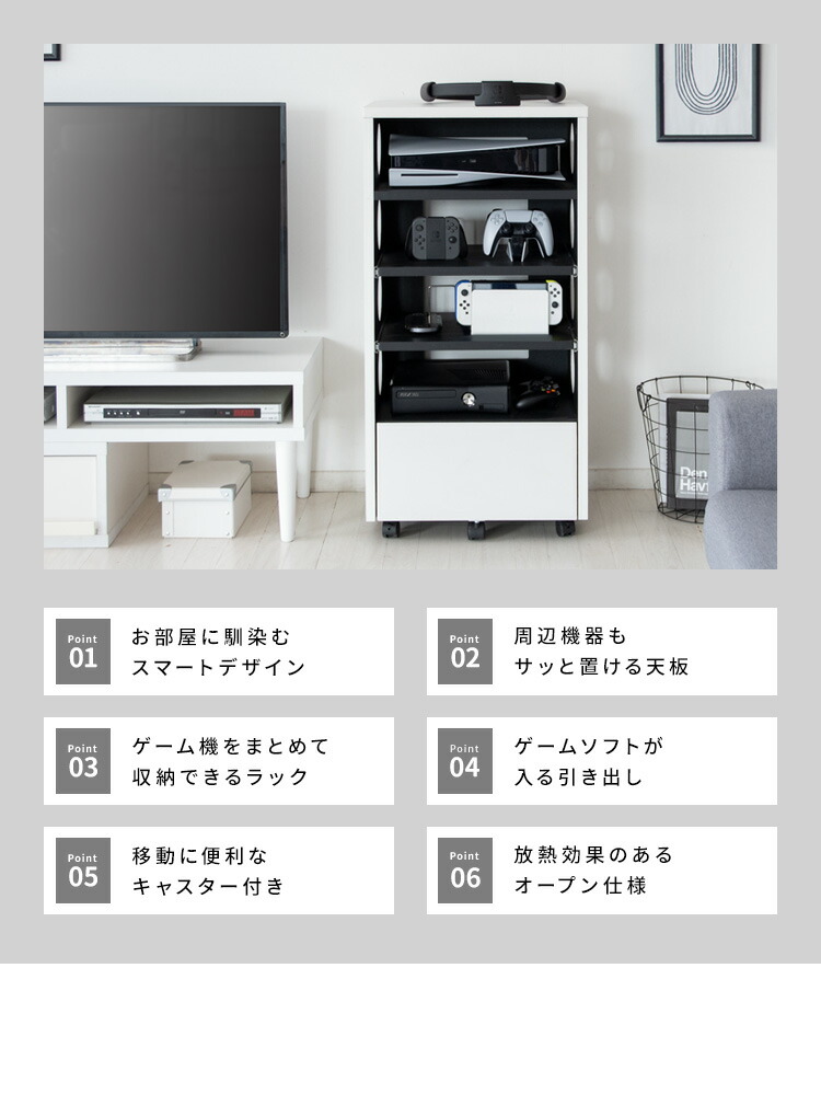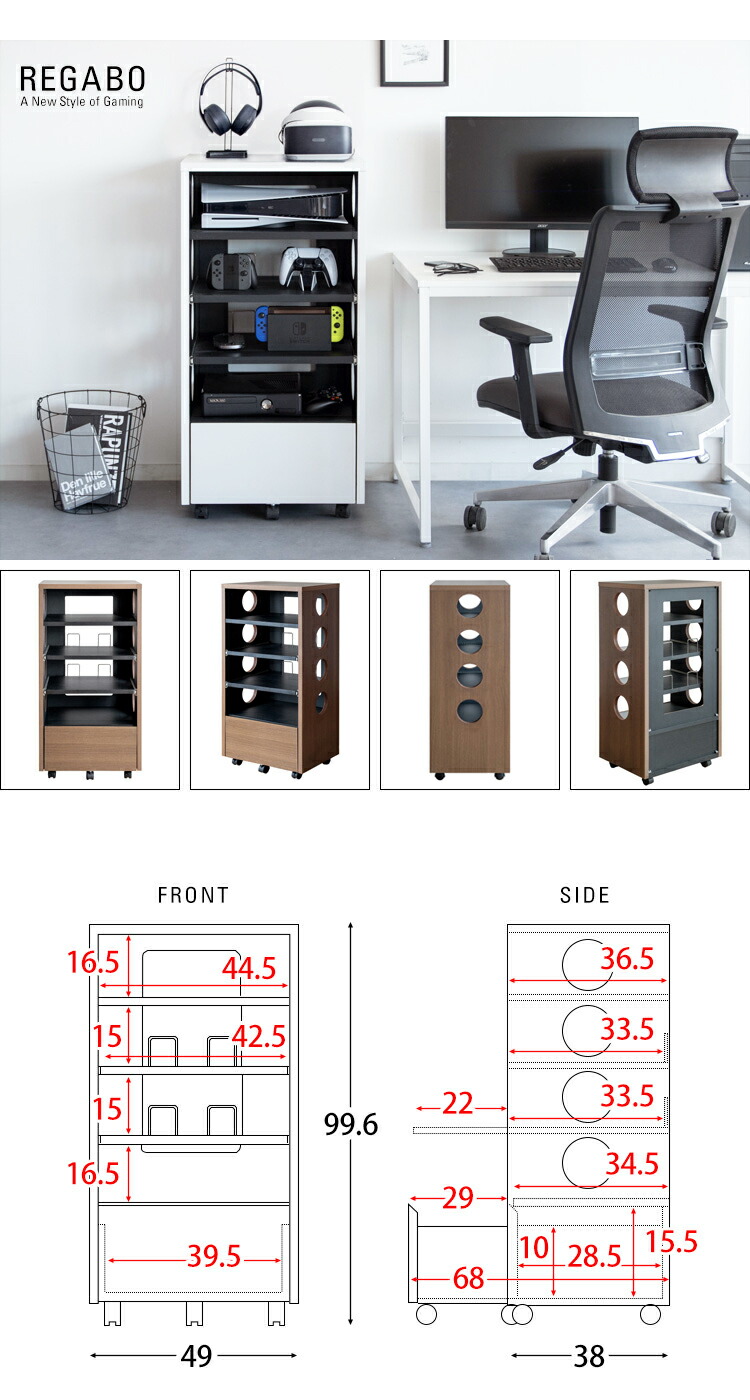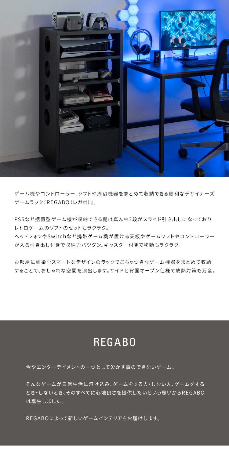 ゲーム機やコントローラー、ソフトや周辺機器をまとめて収納できる便利なデザイナーズゲームラック『REGABO(レガボ)』。 PS5など据置型ゲーム機が収納できる棚は真ん中2段がスライド引き出しになっておりレトロゲームのソフトのセットもラクラク。ヘッドフォンやSwitchなど携帯ゲーム機が置ける天板やゲームソフトやコントローラーが入る引き出し付きで収納力バツグン。キャスター付きで移動もラクラク。お部屋に馴染むスマートなデザインのラックでごちゃつきなゲーム機器をまとめて収納することで、おしゃれな空間を演出します。サイドと背面オープン仕様で放熱対策も万全。