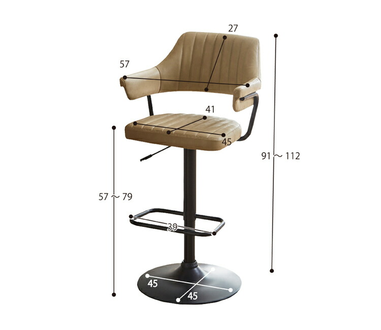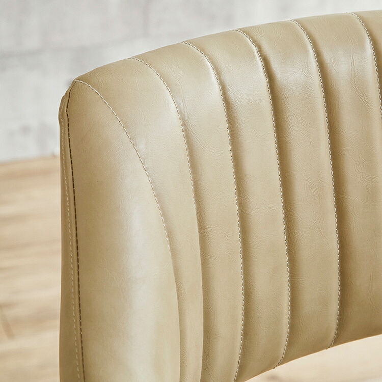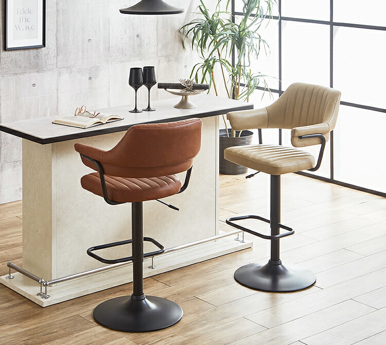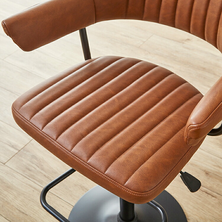 映画のワンシーンで見たような、レトロなデザインが目を引く肘付きのカウンターチェア。背もたれと肘が一体となった座面は身体のラインに合わせて緩やかにカーブ。身体を包み込むようにフィットし、快適な座り心地となっています。張地にはヴィンテージ調のPUレザー(合成皮革)を使用しており、座面・背もたれ・肘部分はウレタンフォーム入りで長時間座っても疲れにくくなっています。座面はガス圧昇降タイプで座面高57~79cmまでの調節ができ、立ち座りの動作がスムーズに行える360度回転式。脚部はデザインを引き締めるブラック色のスチール製を採用。ライトブラウン、クリームの2色よりお選び頂けます。
