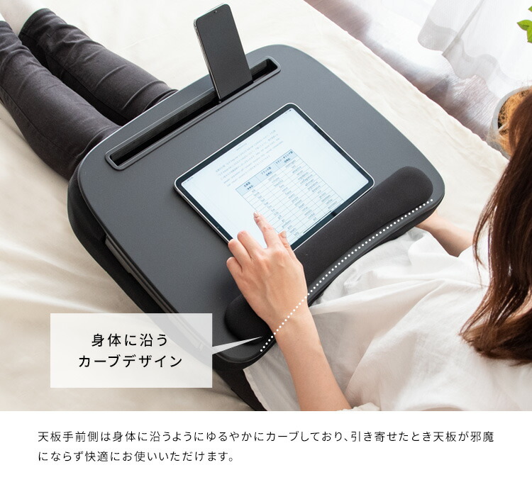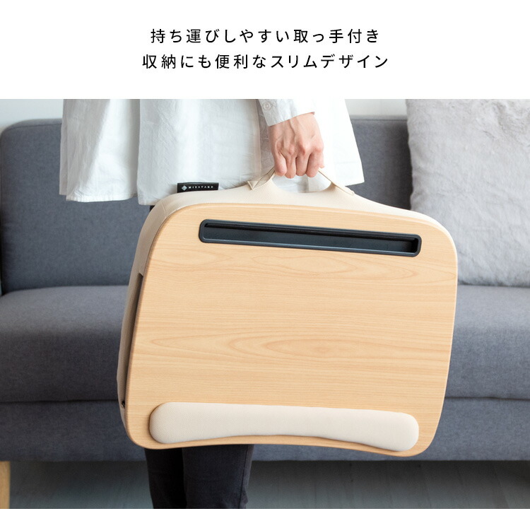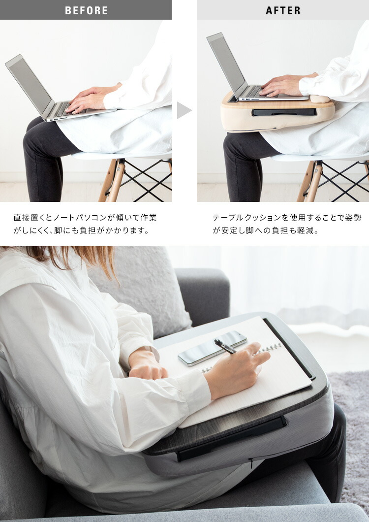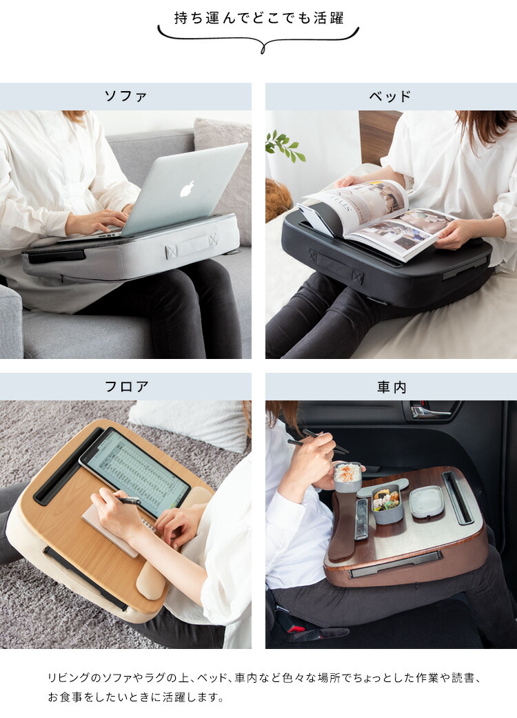 膝上でのちょっとした作業に便利なテーブルクッション。膝に乗せてノートパソコンやタブレットを乗せたり、本を読んだり、お食事を置いたり様々な用途にお使いいただけます。天板にはタブレットを立て掛けられるスタンドと、天板に置いたものの滑り止めにもなる手首の負担を軽減するリフトレストが付いております。クッションのサイドには左右どちらでも出せるスマホスタンド付きのマウストレーを内蔵。持ち手付きで持ち運びもラクラク。ソファやカーペット、ベッド、車内など色んな場所で活躍間違いなしです。カラーはお好みでお選びいただけるナチュラル、グレー、ブラウン、ブラックの4カラーをご用意しました。