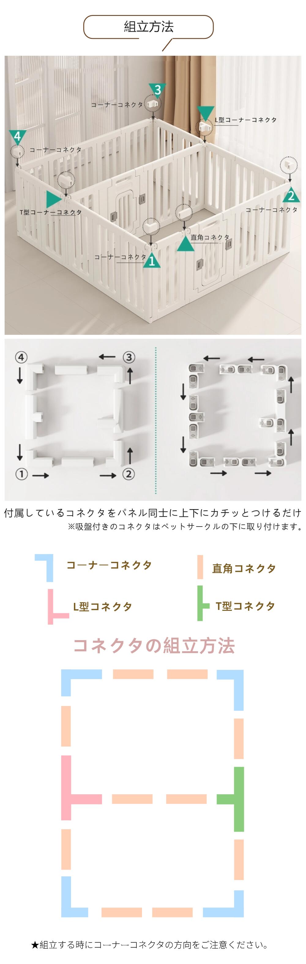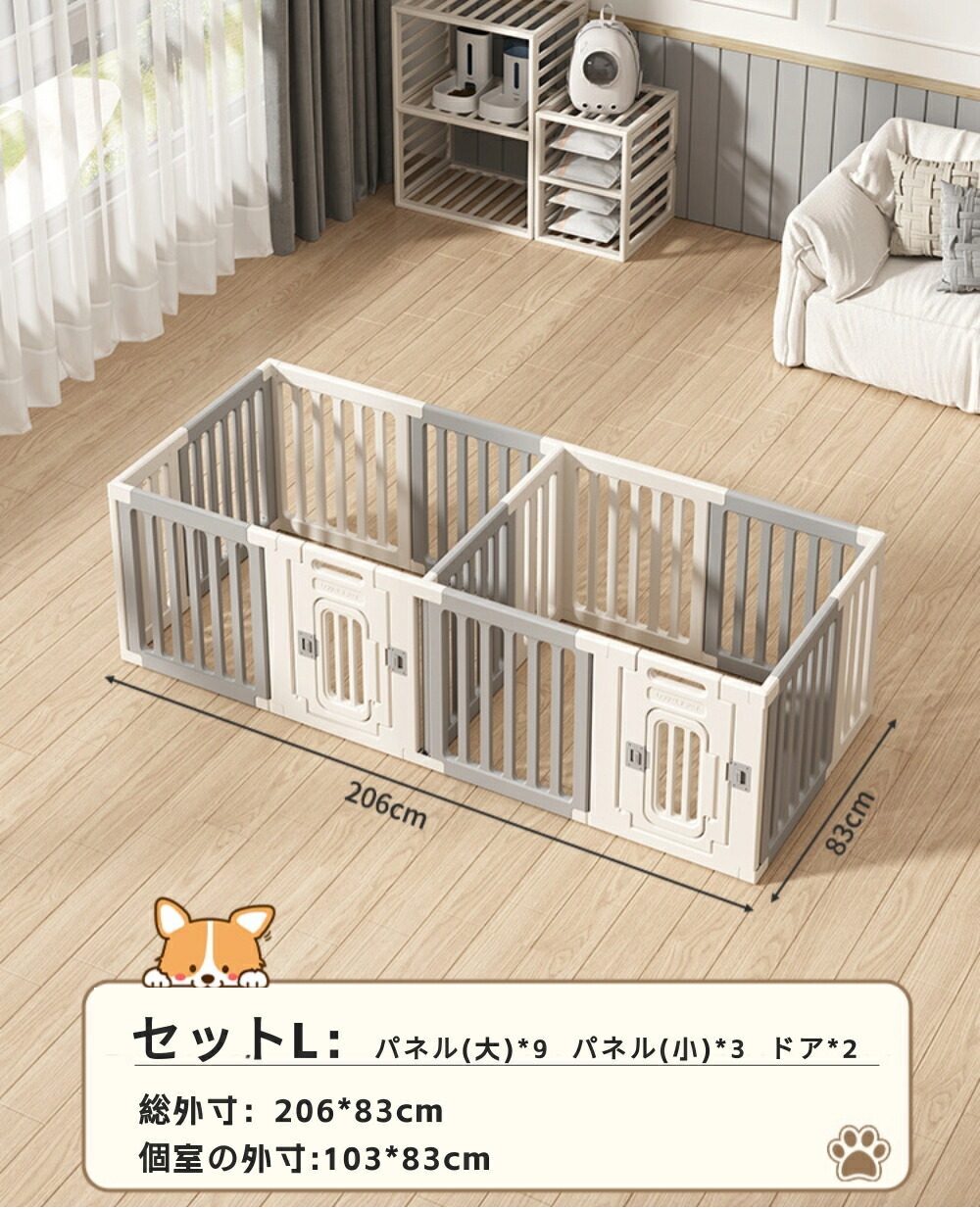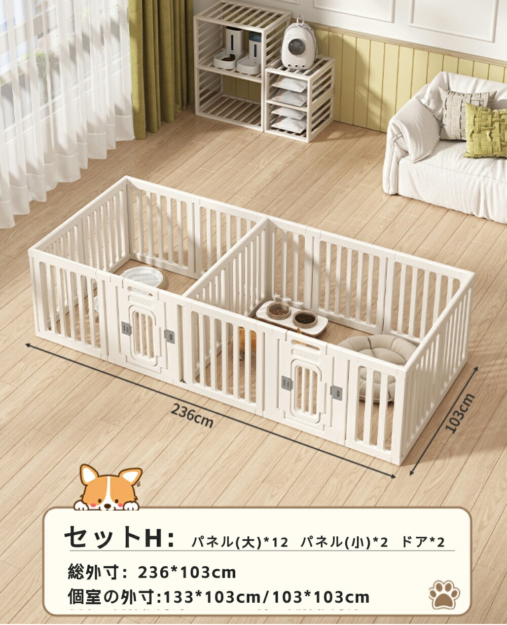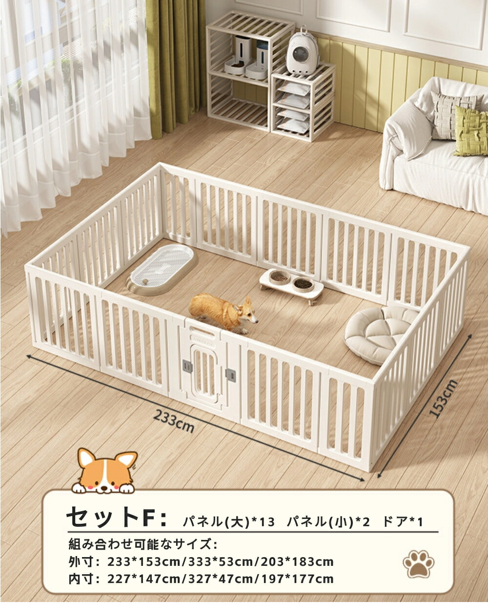 ・自由に組み合わせ可能なパネルは、小型犬から中型犬までのサイズに対応し、ペットの成長や活動量に合わせて最適な空間を作ることができます。