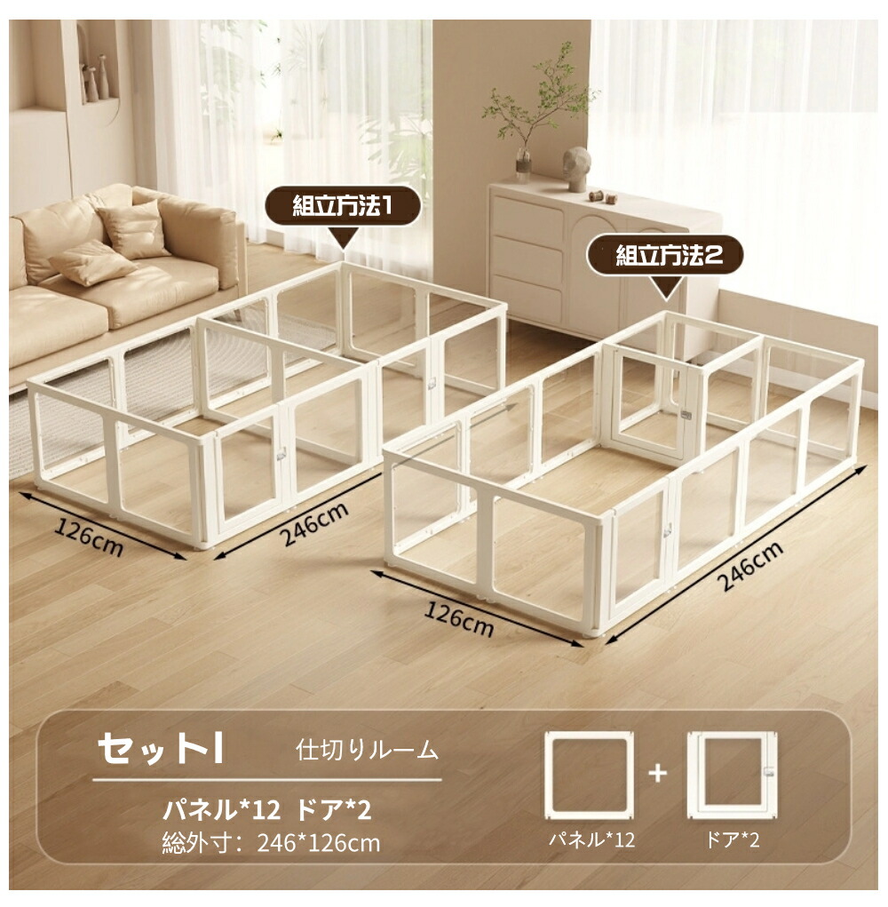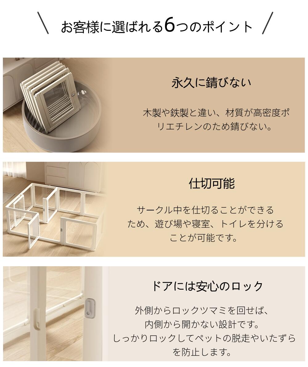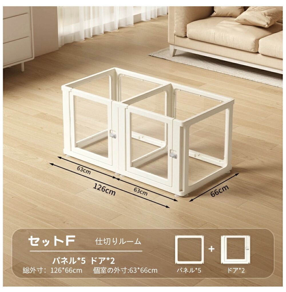 ・自由に組み合わせ可能なパネルは、小型犬から中型犬までのサイズに対応し、ペットの成長や活動量に合わせて最適な空間を作ることができます。