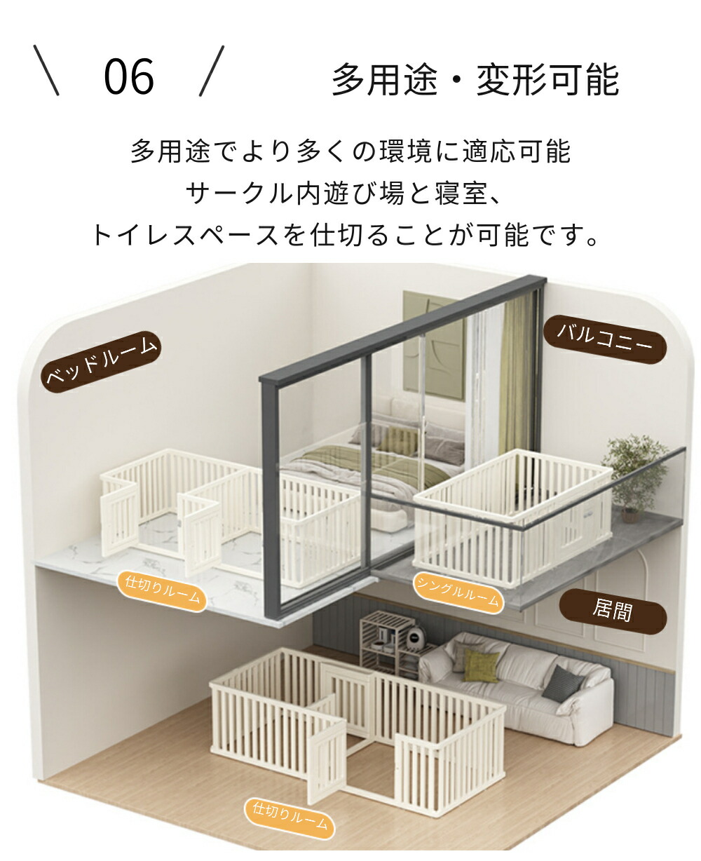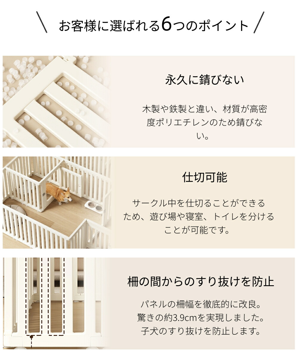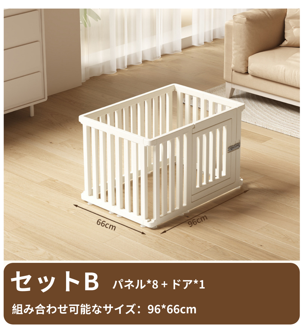 ・自由に組み合わせ可能なパネルは、小型犬から中型犬までのサイズに対応し、ペットの成長や活動量に合わせて最適な空間を作ることができます。