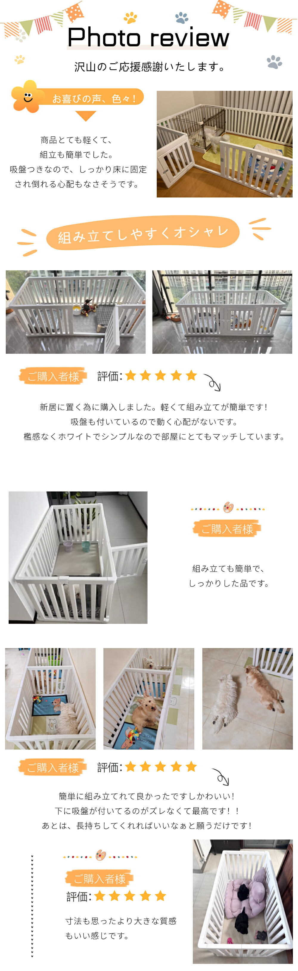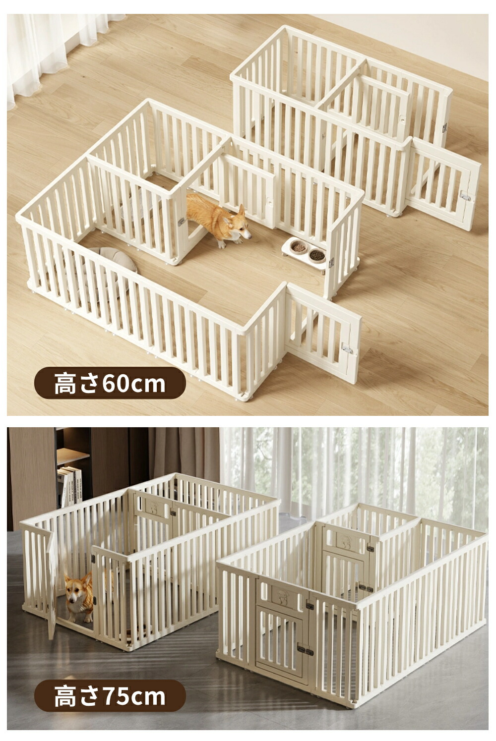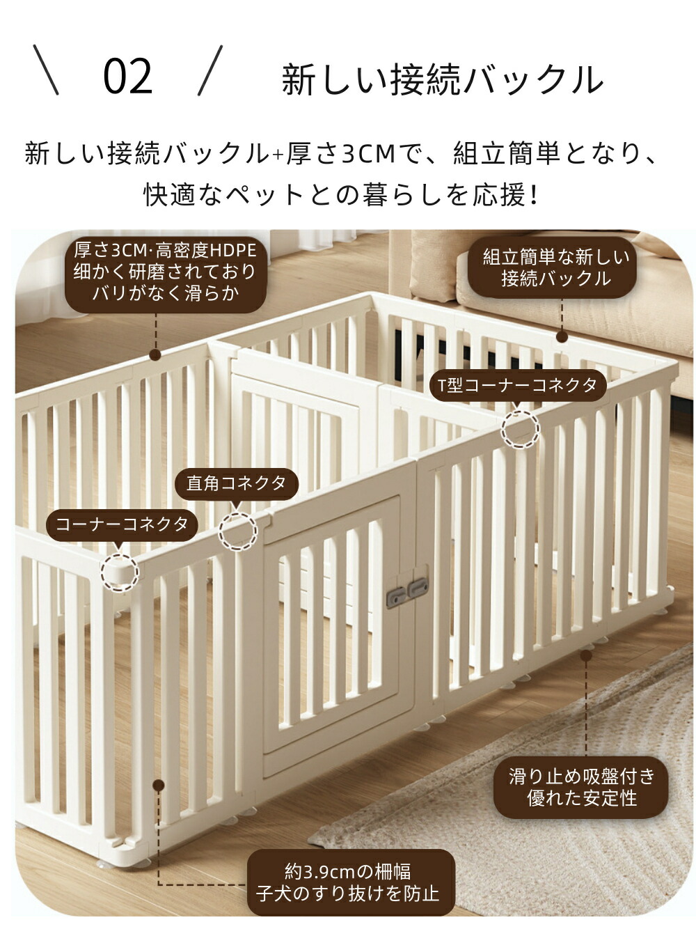 ・自由に組み合わせ可能なパネルは、小型犬から中型犬までのサイズに対応し、ペットの成長や活動量に合わせて最適な空間を作ることができます。