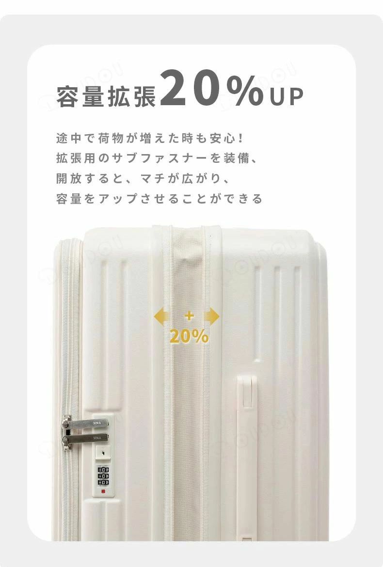 【拡張機能付き/PC+ABSハイブリッド 頑丈なボディ】軽量で耐衝撃性に優れた人気のPCとABS樹脂素材のハイブリッドボディは、3層構造で丈夫で耐久性があります。エンボス加工により傷が目立ちにくく、長期間美しい外観を保ちます。また、ボディの中央に拡張するためのファスナーがあり、開くと約4センチ広がります。拡張時でもシェルが分離せず、スーツケースボディがゆがみにくくなっています。