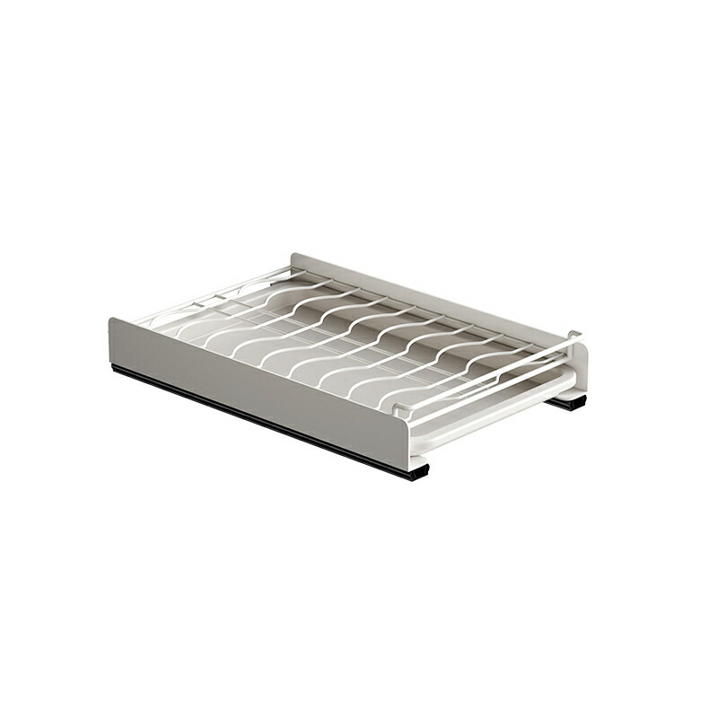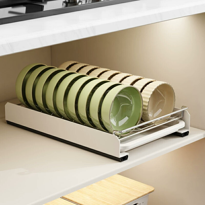 スライドラックの底部には水受けトレイが設計され、洗ったばかりの食器はそのまま入れて水切りできます。