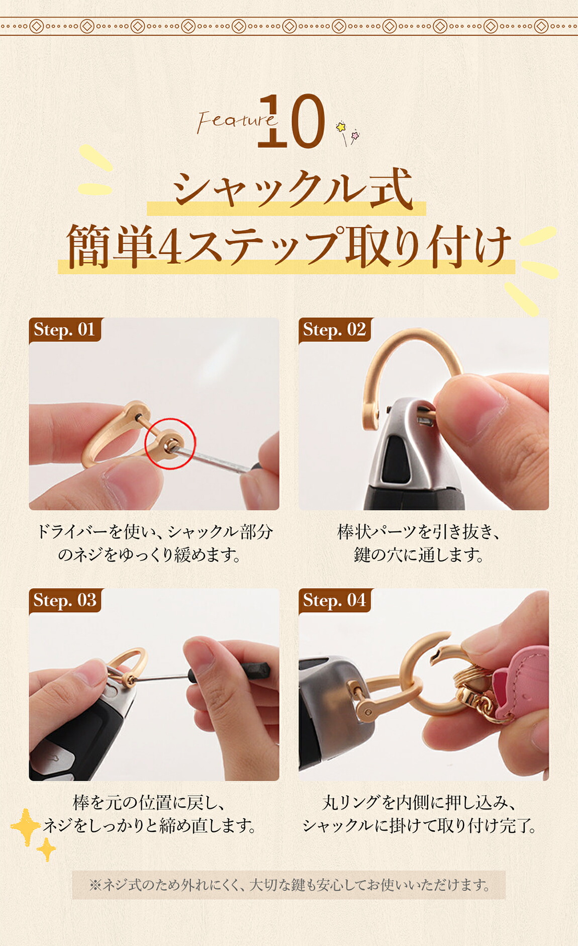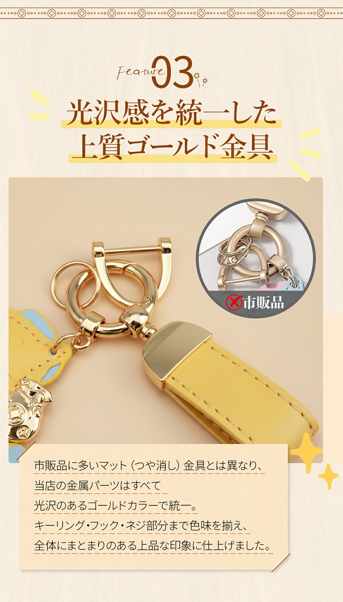 キーリングやフック、ネジ部分まで光沢感のあるゴールドカラーで統一。全体にまとまりのある上品な印象を与えます。