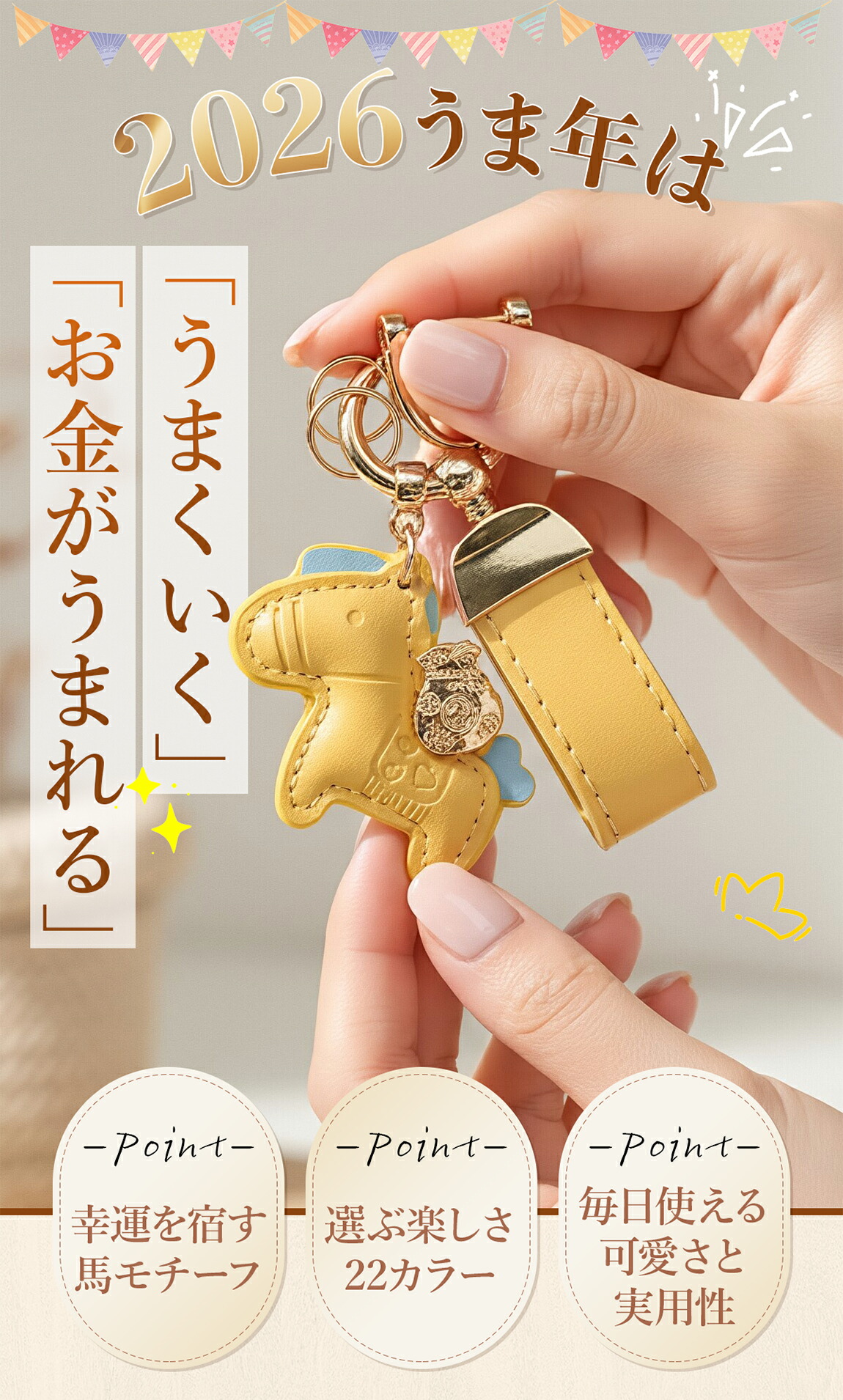 鍵やバッグ、車内にも付けやすく、2026年の「うま年」にちなみ、「お金がうまれる」という前向きな願いも込めました。