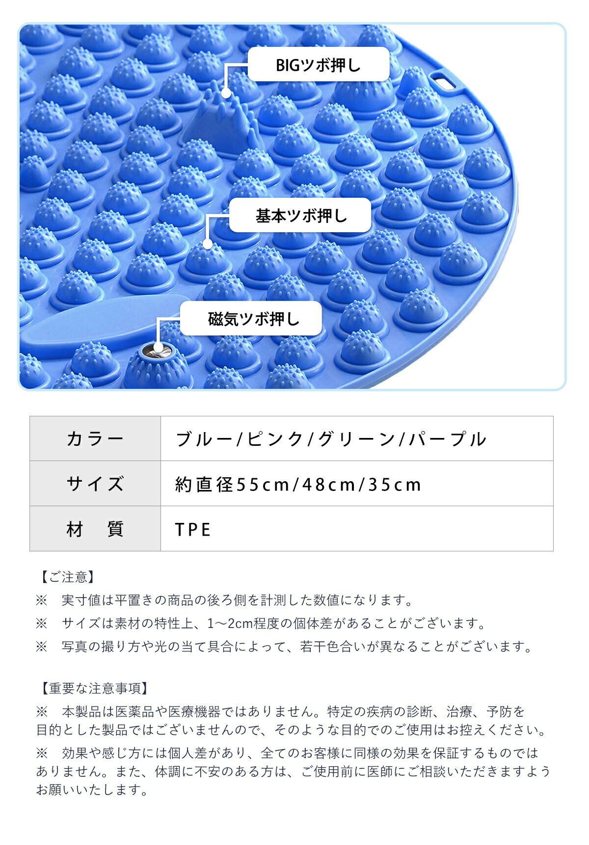 足ツボマット 足つぼ マット 指圧マッ グリーン ピンク パープル ブルー クロッカス ミントグリーン ゼニスブルー 55cm 48cm 35cm