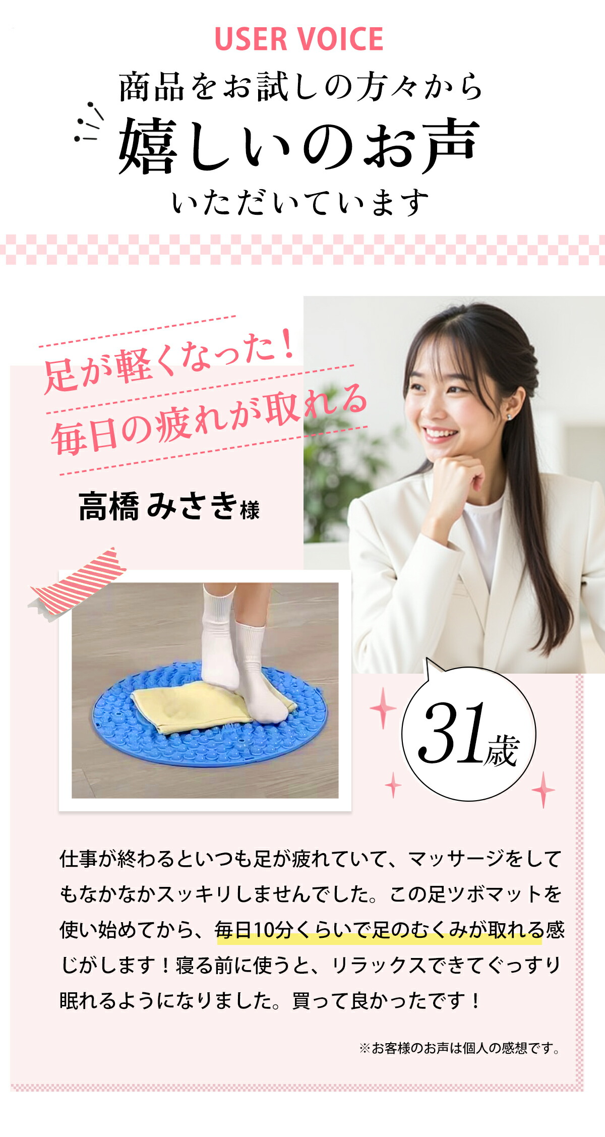 長時間ハイヒールを履く人、長時間の歩行後や立ち仕事におすすめ。痛気持ちいい感覚できて、リフレッシュをしたいときや眠気覚ましにも最適!