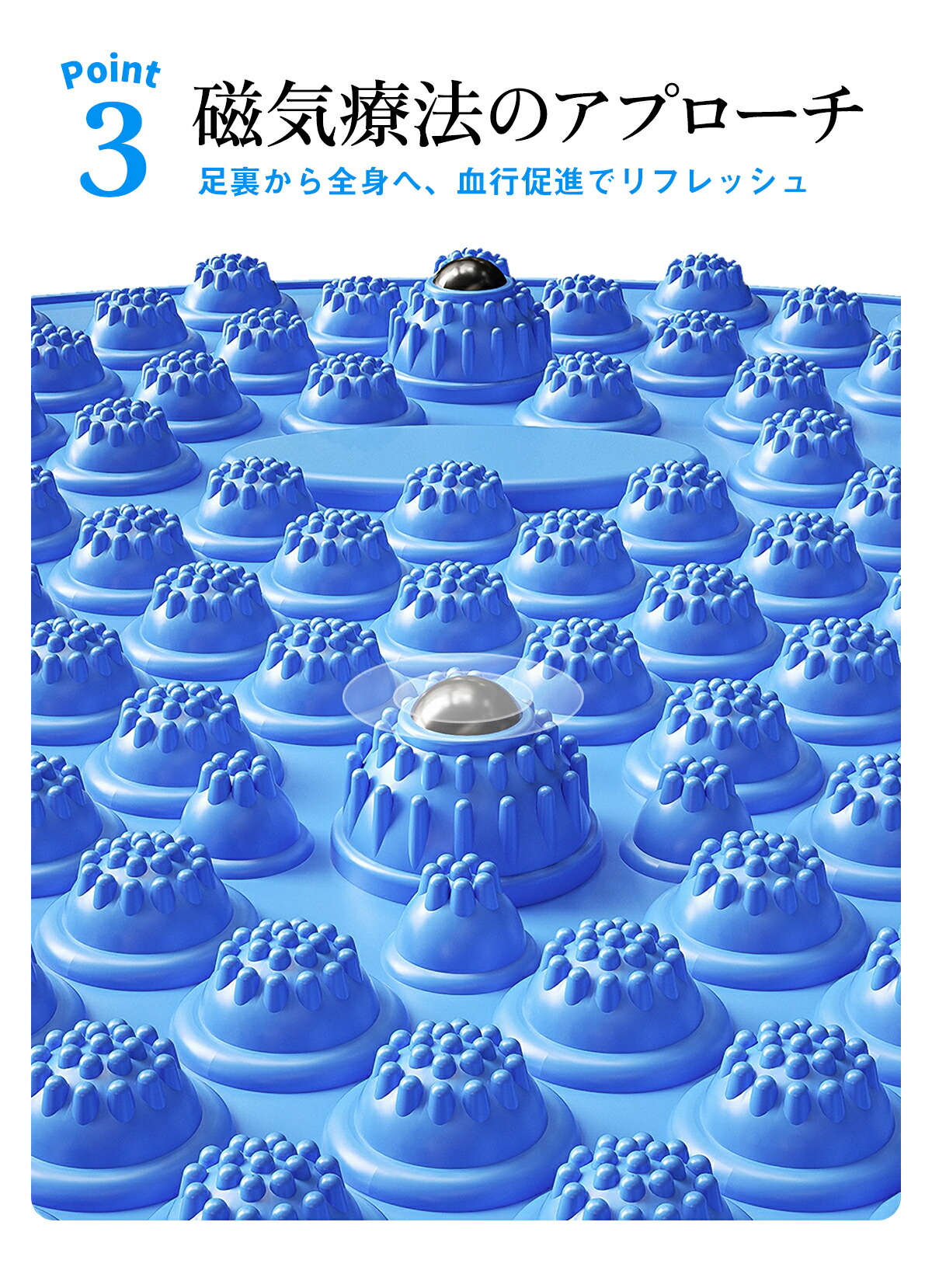 足の置く位置で強度が変わる3種類のツボ押しを配置します。磁石が内蔵されている5つの突起で、足裏のポイントを刺激することにより血行を促進します。三角形の大きな突起が2つあり、ギューっとツボに深く入ります。強めでのマッサージを希望する人におすすめ。1日15分くらい浅い突起に乗ることで足裏の指圧を通じてリフレッシュを促すことができます。自分の調子によって最適な突起が選べるのが初心者にも安心。