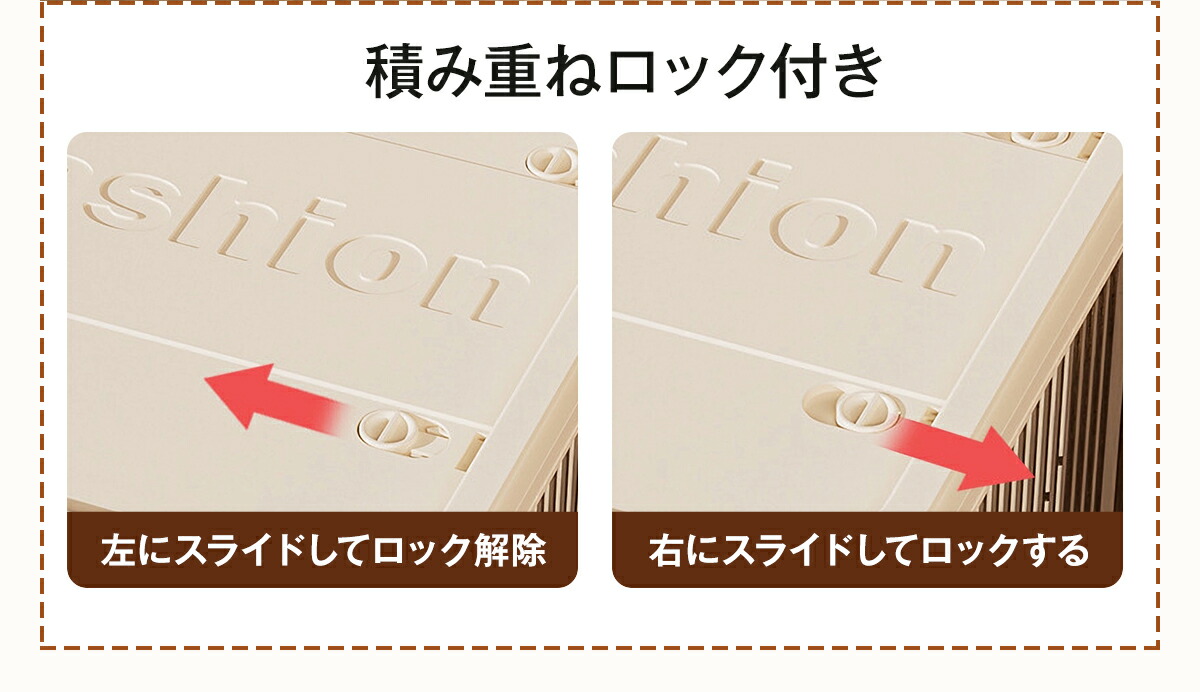 積み重ねロック付きで、高く積んでも倒れにくい安心設計。お部屋のスペースや収納したい量に合わせて、自由に段数を積み上げてカスタマイズできます。