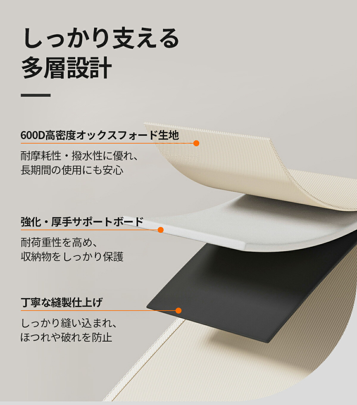 撥水・耐久・耐摩耗性に優れた防水素材を採用。汚れてもサッと拭くだけでお手入れ簡単。厚手サポートボードで型崩れしにくい。