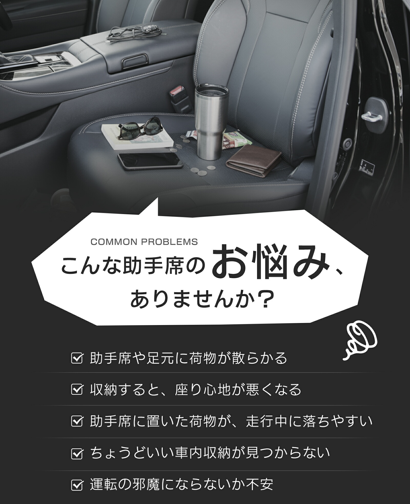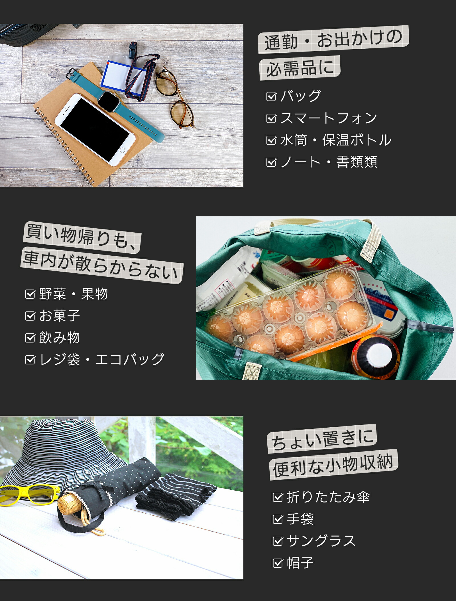 助手席の荷物置きとして使え、散らかりがちな車内をすっきり整理整頓できます。