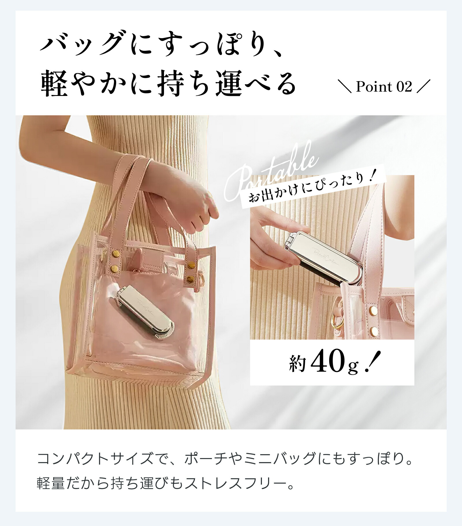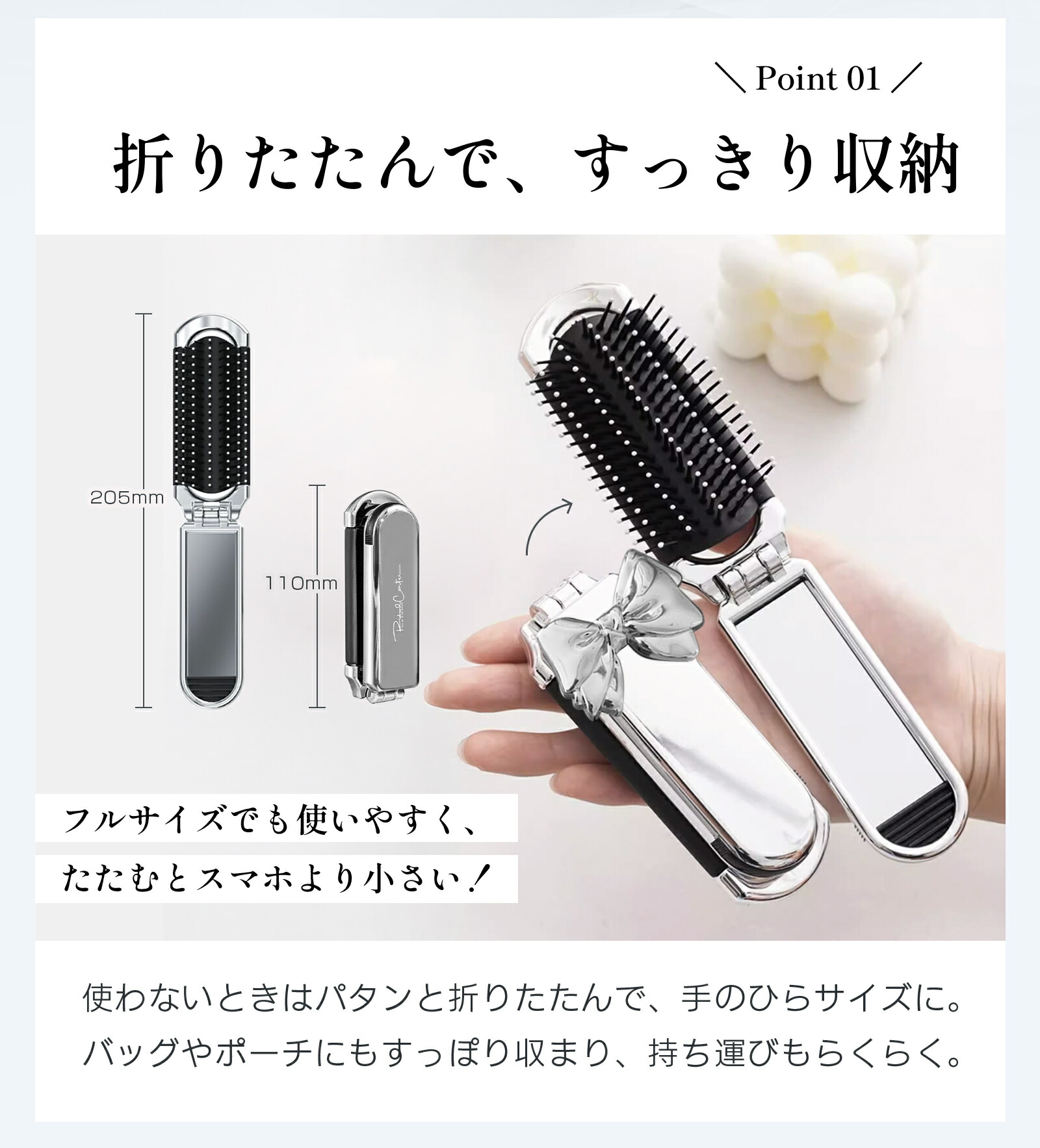 わずか40gと軽量。折りたたみ時は約110 x 40mmとコンパクトになるため、化粧ポーチやカバンなどに取り付けられます。