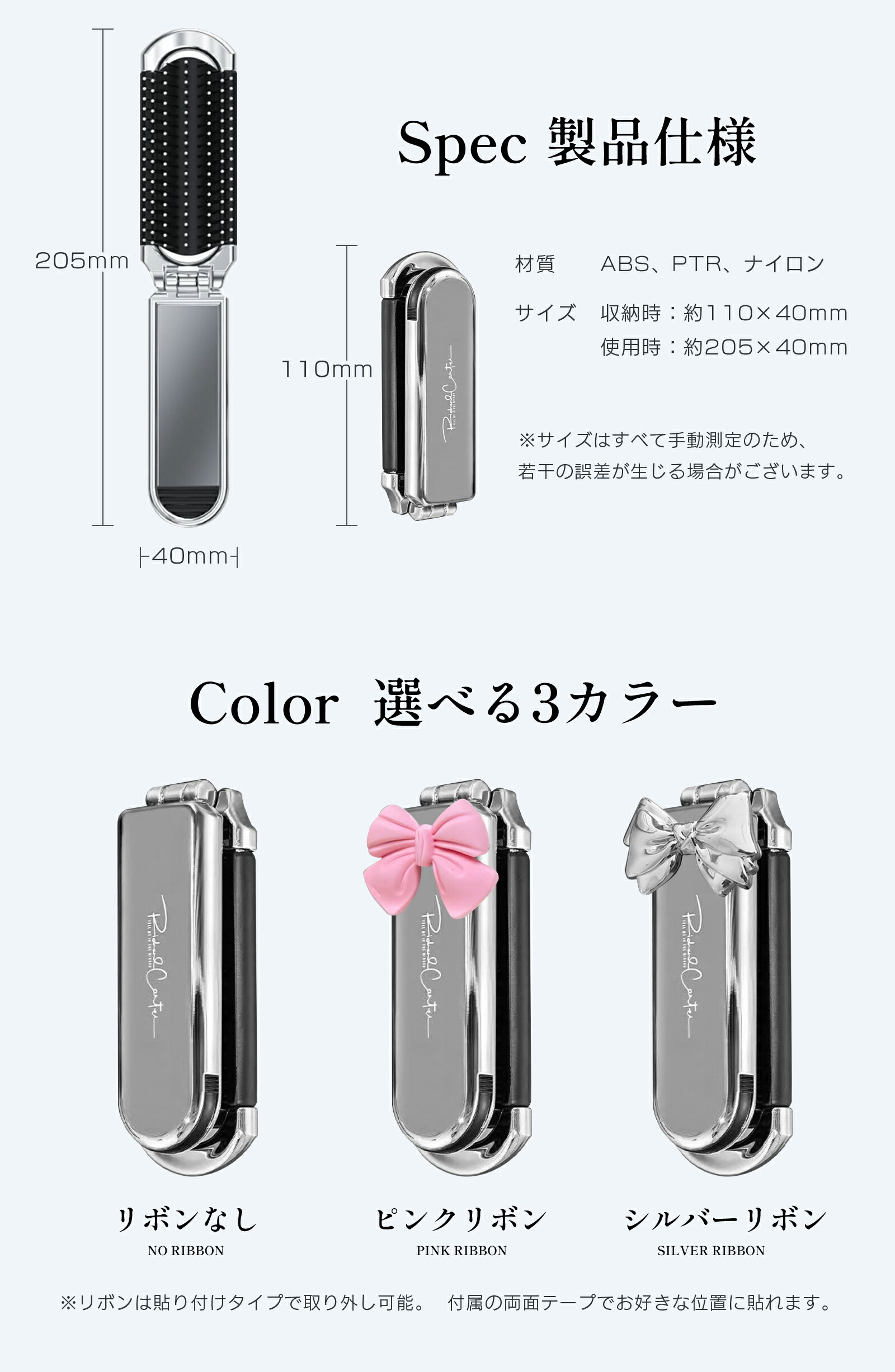 ヘアブラシ 折りたたみ 持ち運び ミラ リボンなし シルバー - リボン ピンク - リボン