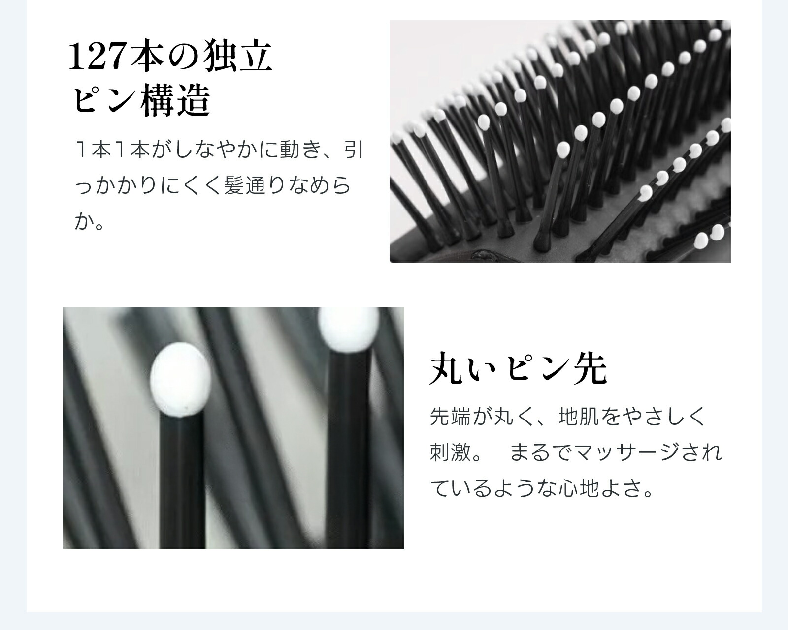 ブラシは頭皮に優しい丸いピンヘッドを採用しており、頭皮に当たっても痛みを与えません。20mmのロングピンと127本の独立構造で髪にかかる負担を軽減し、サラサラとした使い心地です。